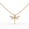 The arrangement of stones creates a directional brilliance pattern across both upper and lower wings, amplifying reflectivity as the pendant moves. The body of the dragonfly is formed using a polished metal framework crafted in 18k gold, providing structural stability and warm tonal contrast against the high-dispersion brilliance of the stones. The refined detailing ensures a balanced distribution of mass, allowing the pendant to remain forward-facing during wear.