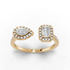 Open galleries beneath the primary stones, halo diamonds, and band accents allow controlled light entry, supporting consistent optical behavior across both brilliant and step-cut diamonds.