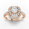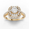 This stunning ring showcases a 0.5 carat round cut diamond at its center, held in a secure prong setting that maximizes its brilliance. Surrounding the center stone are two halo layers of smaller round diamonds, adding depth and an exquisite sparkle to the design. The band itself is also adorned with a continuous line of round diamonds, ensuring a shimmering effect from every angle. Crafted in a sleek and elegant design, this ring combines classic elegance with modern flair, making it a perfect choice for those who appreciate refined simplicity.