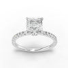 Round lab-grown accent diamonds are set along the upper section of the band in a continuous linear arrangement. Each accent stone is positioned with uniform spacing to preserve alignment and structural consistency along the band. The band width supports the center setting without increasing overall height or altering the ring’s profile. Open sections beneath both the center stone and accent diamonds allow regulated light entry and provide access for inspection and maintenance.