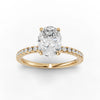The oval center diamond is aligned along the longitudinal axis of the band, supporting balanced proportions and finger-length alignment when viewed from the top.