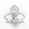 This classic solitaire ring features a stunning 1.5 carat marquise cut diamond, elegantly set in a sleek bezel setting. The marquise shape, with its elongated design and pointed ends, creates a striking and graceful silhouette. The diamond's unique cut enhances its brilliance, allowing it to catch the light beautifully from every angle. The polished band provides a perfect balance, accentuating the central stone's elegance. This ring is a magnificent choice for those who appreciate the distinctive beauty and timeless sophistication of the marquise cut.