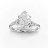 Flanking the center stone, marquise-cut diamonds are arranged in a tapered side-stone layout. Each marquise stone is mounted using micro prongs modeled for tip protection, symmetrical spacing, and uniform light response. Their elongated faceting amplifies the ring’s horizontal brilliance field, creating a seamless visual transition into the central pear.