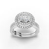 Encircling the center stone are two concentric halos composed of round lab-grown diamonds. Each halo is set at a fixed elevation using micro-prong seats arranged in continuous circular paths. The dual-halo structure creates a stepped height profile that expands outward from the center, adding layered definition without disrupting overall alignment.