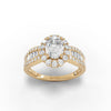 This magnificent ring features an elegant oval shaped center diamond, surrounded by a halo of round diamonds that enhance its brilliance. The band is further embellished with a row of baguette cut diamonds on each side, framed by additional round diamonds, creating a seamless and luxurious design. The contrast between the oval and baguette cuts adds both dimension and texture, while the delicate halo accentuates the center stone’s sparkle. Crafted in fine 18k gold, this ring exudes sophistication and timeless beauty, making it a perfect choice for engagements or special occasions. Its intricate details and stunning craftsmanship make it a true showstopper.