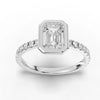 This exquisite ring features a 1.40 carat emerald cut diamond at its center, elegantly set in a bezel setting that highlights the stone's clarity and geometric beauty. The band is adorned with a continuous row of shimmering diamonds, adding a touch of brilliance and sophistication. Each accent diamond is meticulously placed, creating a harmonious and radiant look that enhances the central stone's allure. With its combination of modern design and timeless elegance, this ring is a stunning choice for those who appreciate refined craftsmanship and luxurious detail.