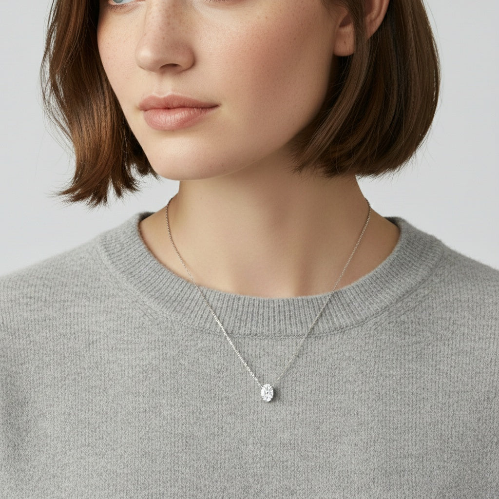 Discover the allure of our oval cut diamond pendant, a masterpiece of timeless elegance. This pendant showcases a stunning oval cut diamond, known for its elongated shape and remarkable sparkle. The diamond is gracefully held in a sleek prong setting, maximizing its brilliance and allowing light to dance through every facet. Suspended from a delicate, interwoven chain, the pendant exudes sophistication and charm. Perfect for any special occasion, this piece adds a touch of refined luxury to your jewelry collection.