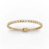 This exquisite bracelet showcases a flawless line of meticulously set round diamonds, each encased in a smooth, polished gold bezel setting. The diamonds radiate unparalleled brilliance, creating a continuous shimmer that gracefully adorns the wrist. The bracelet's sleek, elegant design is complemented by a secure and discreet clasp, ensuring both beauty and practicality. The harmonious blend of luxurious gold and sparkling diamonds results in a piece that exudes timeless sophistication and refined elegance, perfect for adding a touch of glamour to any ensemble.