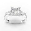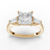 This exquisite engagement ring is beautifully crafted in 18kt gold, featuring a striking princess cut diamond at its center. The bold, geometric shape of the princess cut diamond is perfectly complemented by tapered baguettes on either side, enhancing the overall elegance of the design. The band itself is gracefully adorned with smaller round diamonds, adding a soft sparkle that enhances the ring’s brilliance. The combination of the sharp, contemporary princess cut and the sophisticated baguette accents creates a timeless and luxurious design, making this ring an unforgettable symbol of love and commitment.