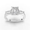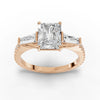 This exquisite engagement ring is crafted in 18kt gold, featuring a stunning radiant cut diamond at its center, radiating unparalleled brilliance and sophistication. The sleek, angular design of the radiant cut diamond is complemented by tapered baguettes on either side, which enhance the overall geometry and elegance of the piece. The band is delicately adorned with a line of smaller round diamonds, adding an extra layer of sparkle and refining the ring’s timeless design. The harmonious balance of the radiant center stone and tapered baguettes creates a modern yet classic look, making this ring a perfect symbol of everlasting love and commitment.