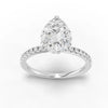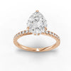 This exquisite ring is a true marvel of artistry and elegance, showcasing a breathtaking 2 carat pear cut diamond at its center. The diamond, securely held in a sophisticated prong setting, dazzles with unmatched brilliance, capturing and reflecting light from every angle. The band is meticulously adorned with a row of smaller diamonds, each carefully set to create a continuous shimmer that perfectly complements the central gem. The blend of the classic pear cut diamond with the modern elegance of the diamond studded band creates a harmonious balance of timeless beauty and contemporary sophistication. This ring is a masterful symbol of enduring love and refined taste, designed to captivate and enchant all who behold its splendor.