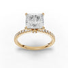 Round lab-grown accent diamonds are set along the upper section of the band in a continuous linear arrangement. Each accent stone is positioned with uniform spacing to preserve alignment and structural consistency along the band. The band width is engineered to support the center setting without increasing overall height or altering the ring’s profile. Open sections beneath both the center stone and accent diamonds allow regulated light entry and provide access for inspection and maintenance.