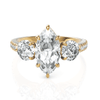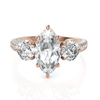 This exquisite three stone ring features a 1.5 carat marquise cut diamond at its center, beautifully flanked by two brilliant round diamonds. The marquise shape, with its elegant and elongated design, adds a touch of sophistication, while the round diamonds enhance the overall sparkle and charm. The band is crafted to highlight the stunning trio of diamonds, creating a harmonious and eye-catching look. Perfect for those who appreciate timeless elegance and refined design, this ring is a testament to exceptional craftsmanship.