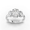 Two matching oval diamonds are placed horizontally along the band on either side of the center stone, maintaining consistent spacing, equal height, and aligned proportions.