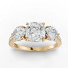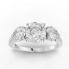 This exquisite three stone engagement ring features a mesmerizing 1.5 carat cushion cut diamond at its center, flanked by two radiant 0.5 carat round diamonds. The central cushion cut stone is nestled in a secure prong setting, allowing its brilliance to shine forth with captivating fire and sparkle. The round diamonds enhance the allure of the central gem, creating a perfect balance of elegance and brilliance. The band is adorned with a delicate array of accent diamonds, adding an ethereal shimmer that catches the light beautifully. This ring is a harmonious blend of timeless sophistication and modern elegance, making it a stunning symbol of your unique love story.