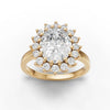 This stunning engagement ring showcases a 2.5 carat oval center stone, encircled by a halo of shimmering round accent stones. The sleek band gracefully narrows as it nears the central cluster, creating a beautiful balance between the bold centerpiece and the refined band. Delicate prongs secure each stone, adding sophistication and ensuring maximum brilliance from every angle. This classic halo ring captures timeless elegance and is a perfect symbol of enduring love.