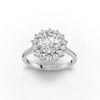 The band remains slender along its entire length and transitions directly into the halo arrangement. Its uniform width ensures that the upper cluster remains the primary structural element without interference from the shank. Accent stones are limited to the halo, leaving the band smooth and uninterrupted.