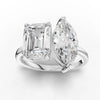 This stunning two stone engagement ring blends modern elegance with classic sophistication. It features a brilliant 2 carat emerald cut diamond, known for its clean lines and timeless appeal. Next to it, a 1.5 carat marquise cut diamond shines with its unique, elongated shape. Both stones are set in a polished gold band that highlights their beauty and sparkle. The combination of the geometric emerald cut and the graceful marquise creates a striking visual contrast, making this ring a perfect symbol of lasting love and impeccable style.