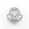 This exquisite ring features a captivating oval cut diamond at its center, surrounded by a sparkling halo of smaller round diamonds. The halo enhances the brilliance of the central diamond, giving the ring a larger and more radiant appearance. The band is encrusted with pave set diamonds, adding a touch of glamour and shimmer that complements the centerpiece. The elegant prong setting elevates the oval diamond, allowing light to pass through for maximum sparkle. This halo engagement ring exudes sophistication and timeless beauty, making it a perfect choice for someone who desires a ring that combines