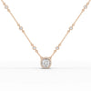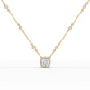 This exquisite necklace features a radiant centerpiece—a cushion cut gemstone encircled by a halo of smaller, sparkling diamonds that amplify its brilliance and allure. The pendant is gracefully suspended from a delicate chain adorned with evenly spaced bezel set diamonds, adding a touch of sparkle throughout its length. Each diamond is meticulously set to ensure maximum light reflection, enhancing the necklace's overall luminosity. The combination of the halo setting and the scattered diamonds along the chain creates a harmonious blend of elegance and sophistication. This necklace is designed to sit perfectly on the neckline, making it an ideal accessory for adding a touch of refined glamour to any outfit, whether for a special occasion or everyday elegance.