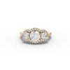 This Three Stone Halo Lab Grown Diamond Engagement Ring features a sophisticated design with a central lab grown diamond flanked by two smaller stones, all encircled by a delicate halo of accent diamonds. Crafted for brilliance and ethical luxury, it offers timeless elegance while ensuring sustainable sourcing. The precise setting enhances the sparkle, making it an exceptional choice for a meaningful and responsible symbol of commitment.