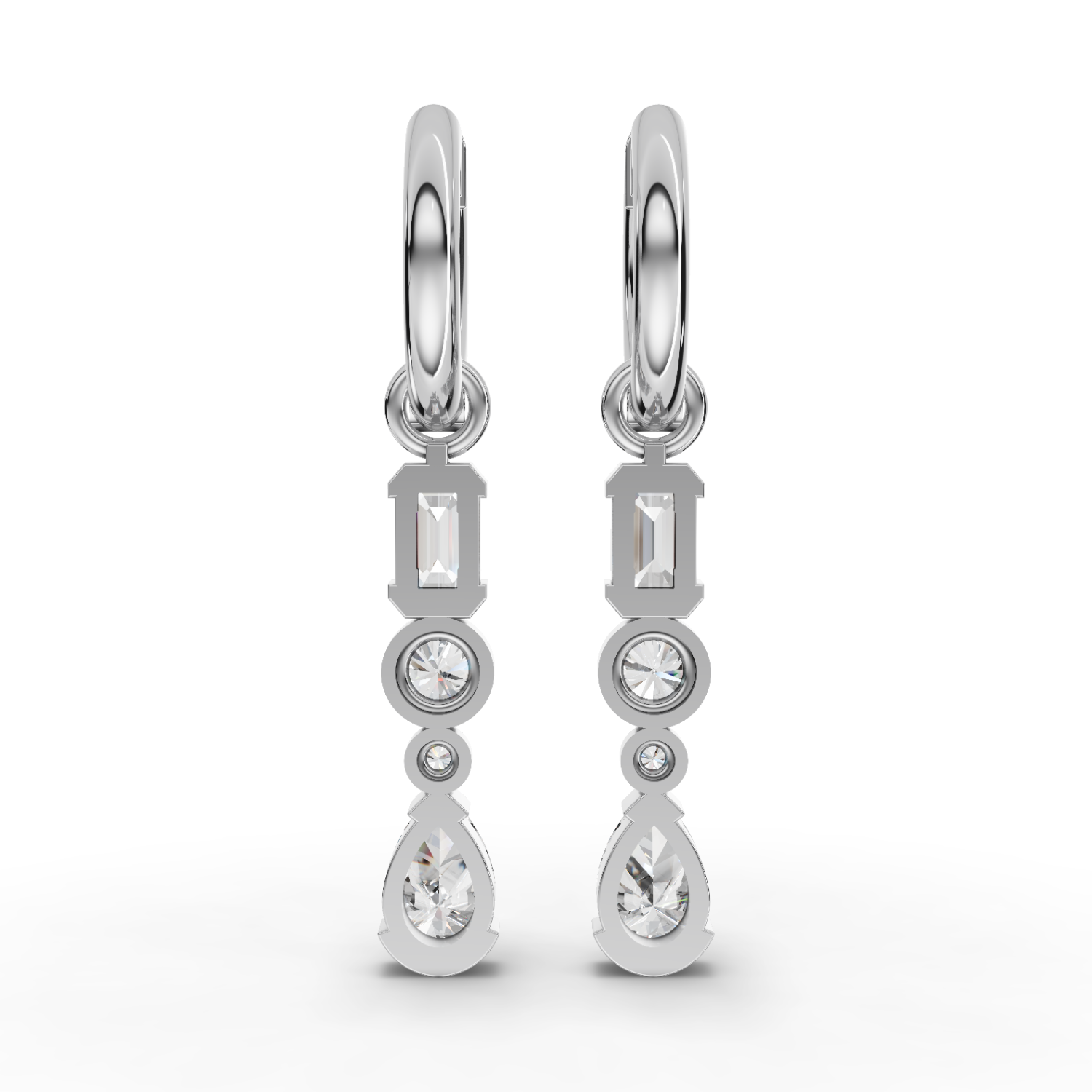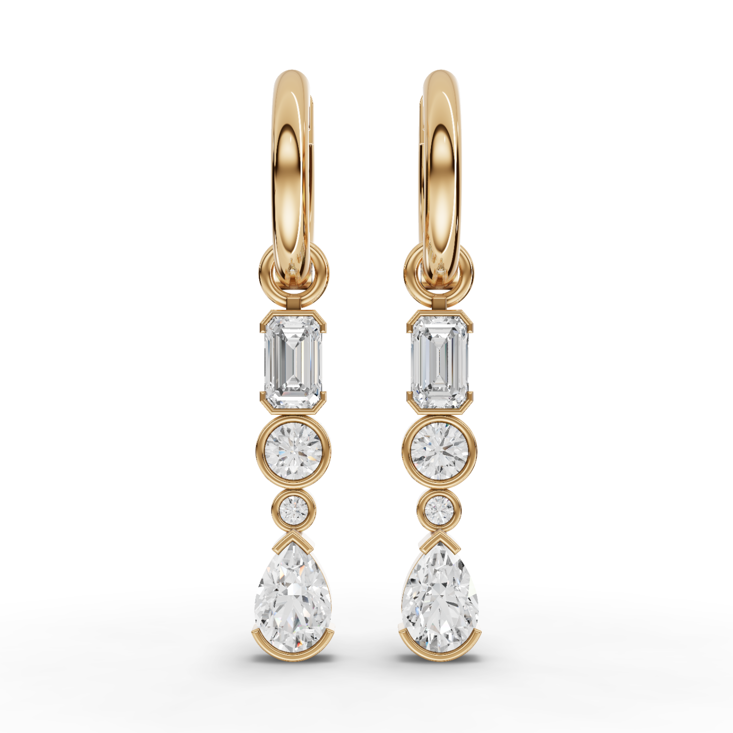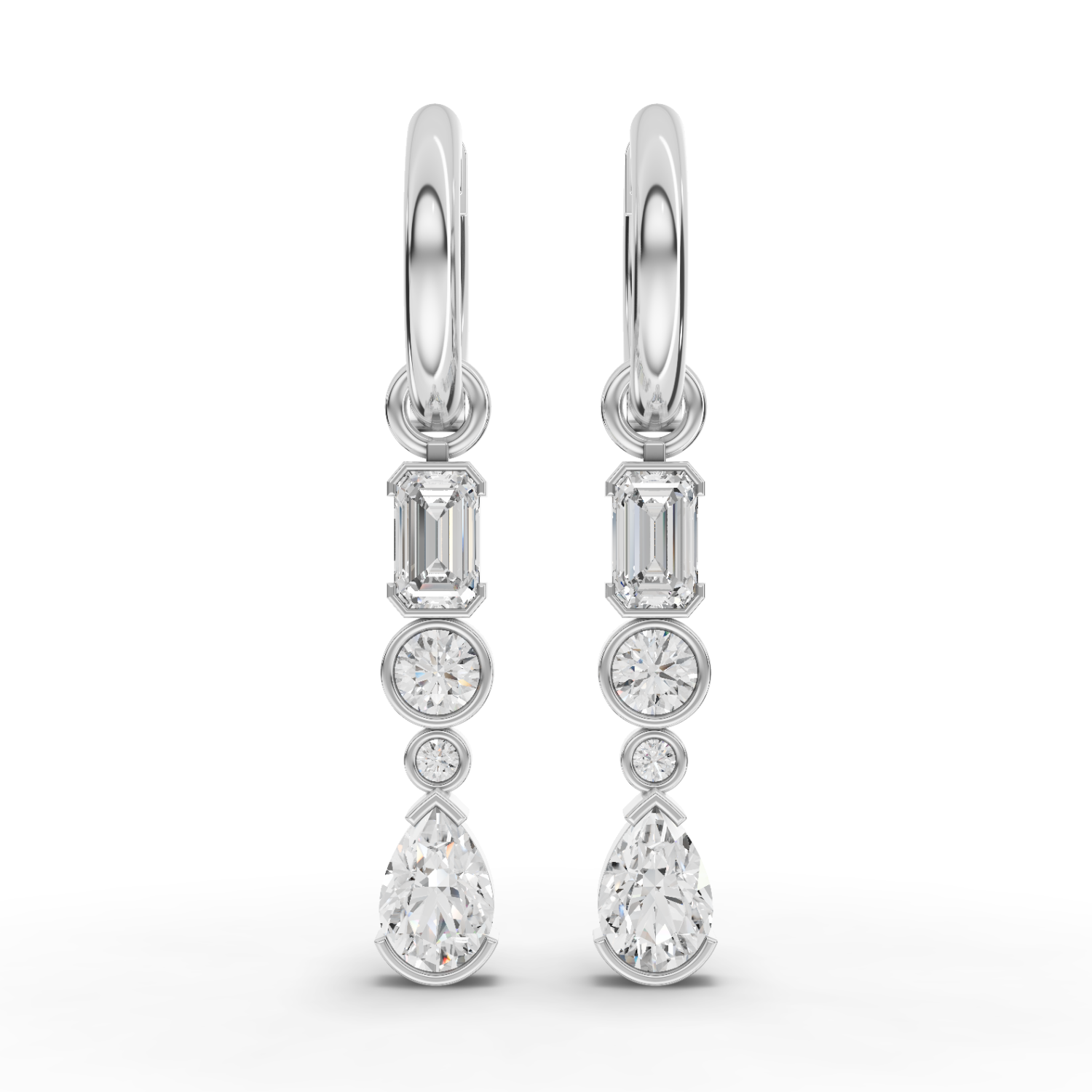 The coordinated drop earrings feature four round lab-grown diamonds totaling approximately 0.23 ct, paired with two emerald-cut diamonds totaling approximately 0.52 ct and two pear-shaped diamonds with a combined approximate weight of 0.71 ct. The elongated design enhances light reflection while maintaining a clean, contemporary profile.
