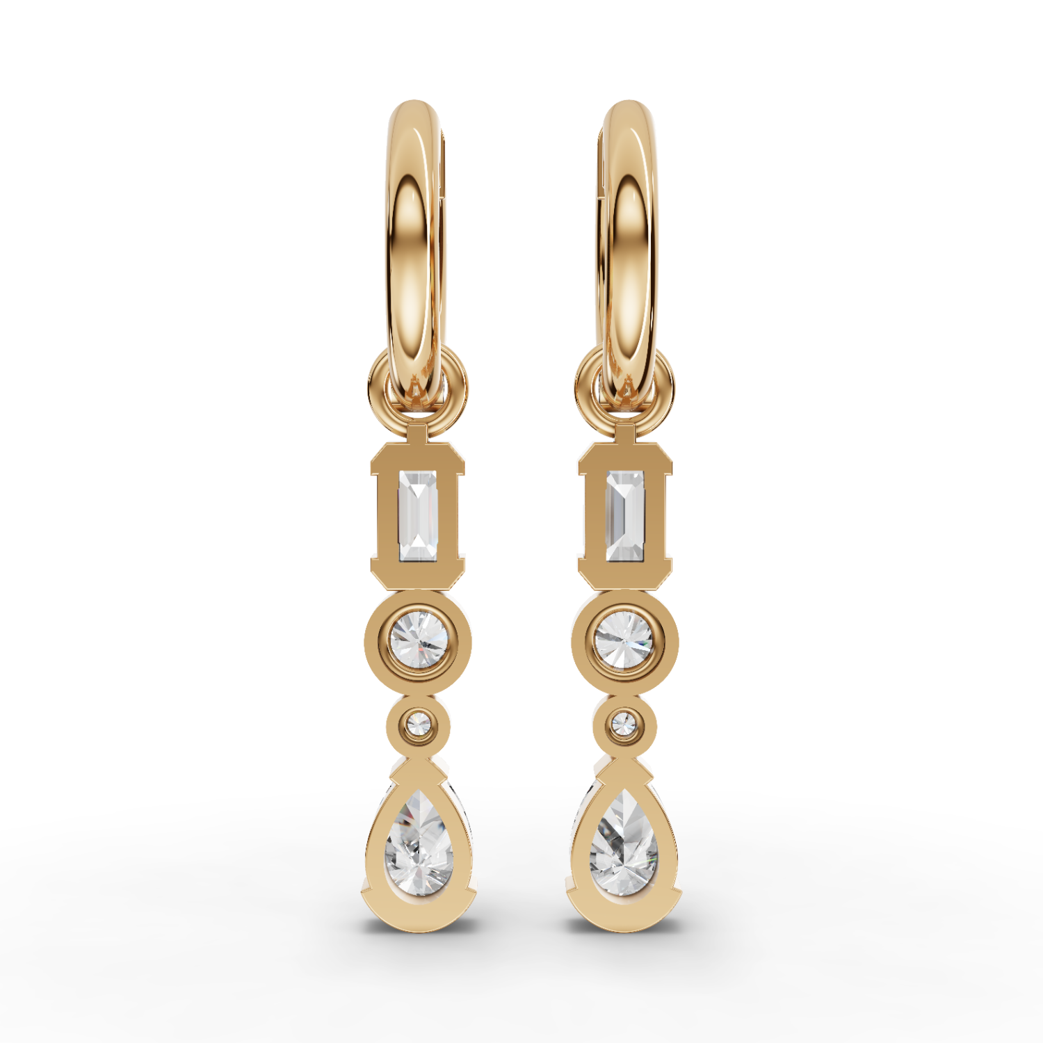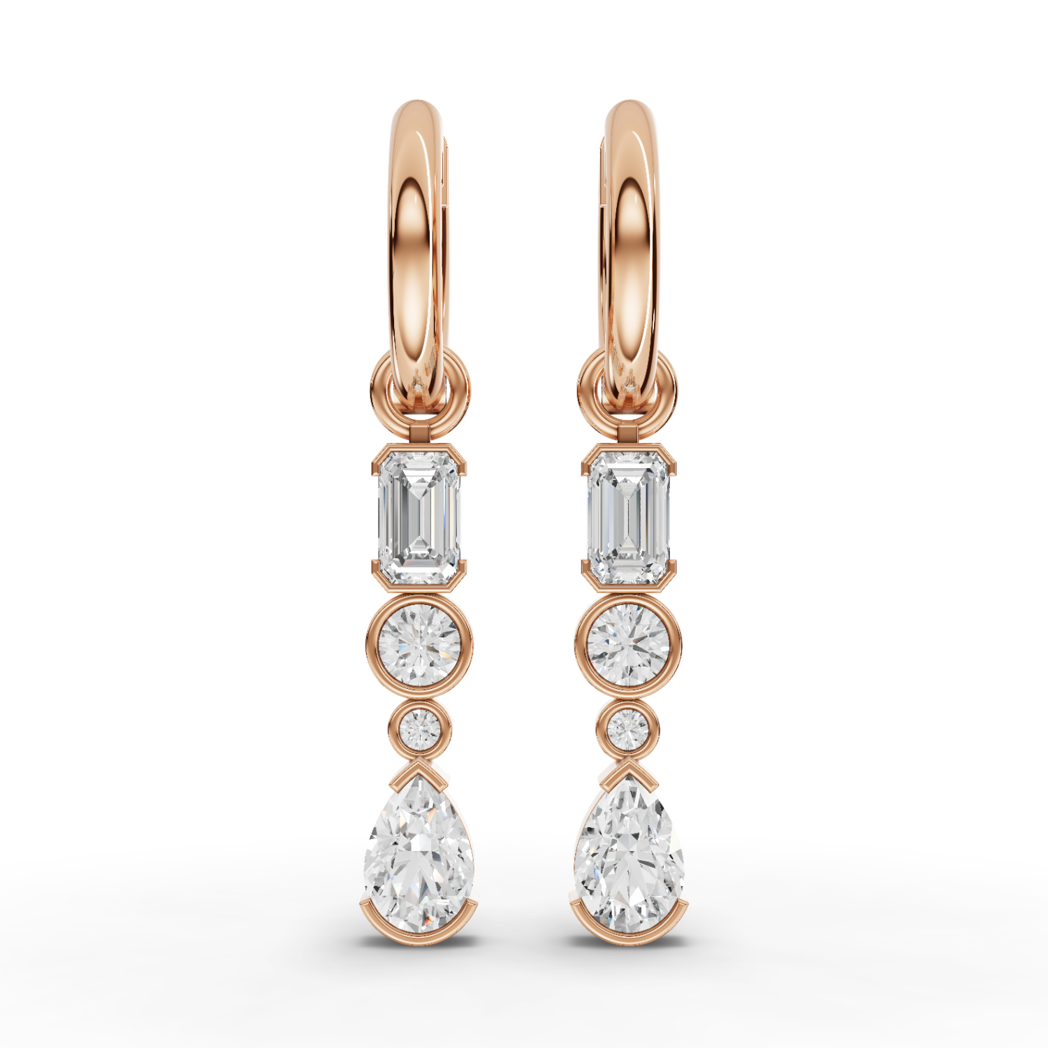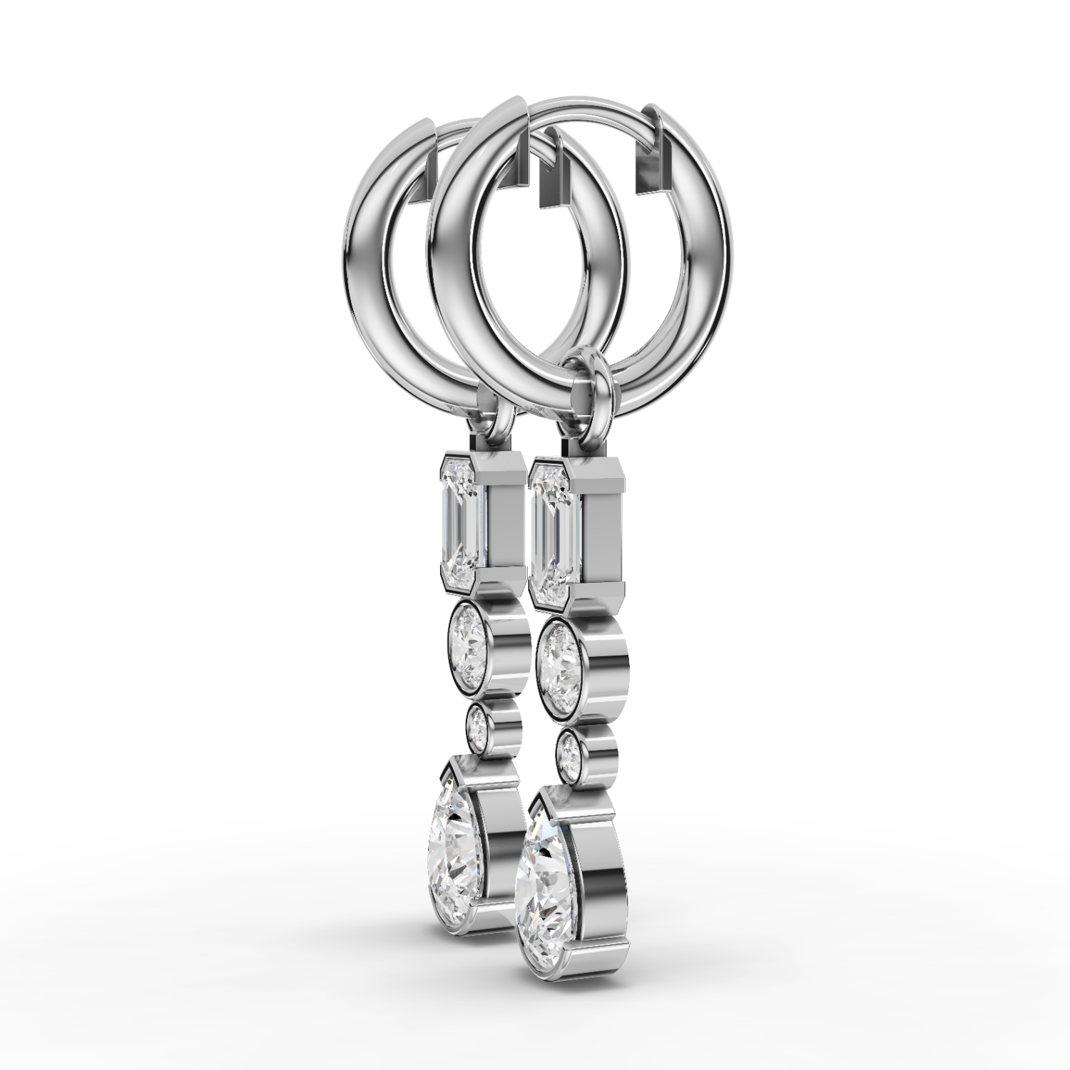 The coordinated drop earrings feature four round lab-grown diamonds totaling approximately 0.23 ct, paired with two emerald-cut diamonds totaling approximately 0.52 ct and two pear-shaped diamonds with a combined approximate weight of 0.71 ct. The elongated design enhances light reflection while maintaining a clean, contemporary profile.