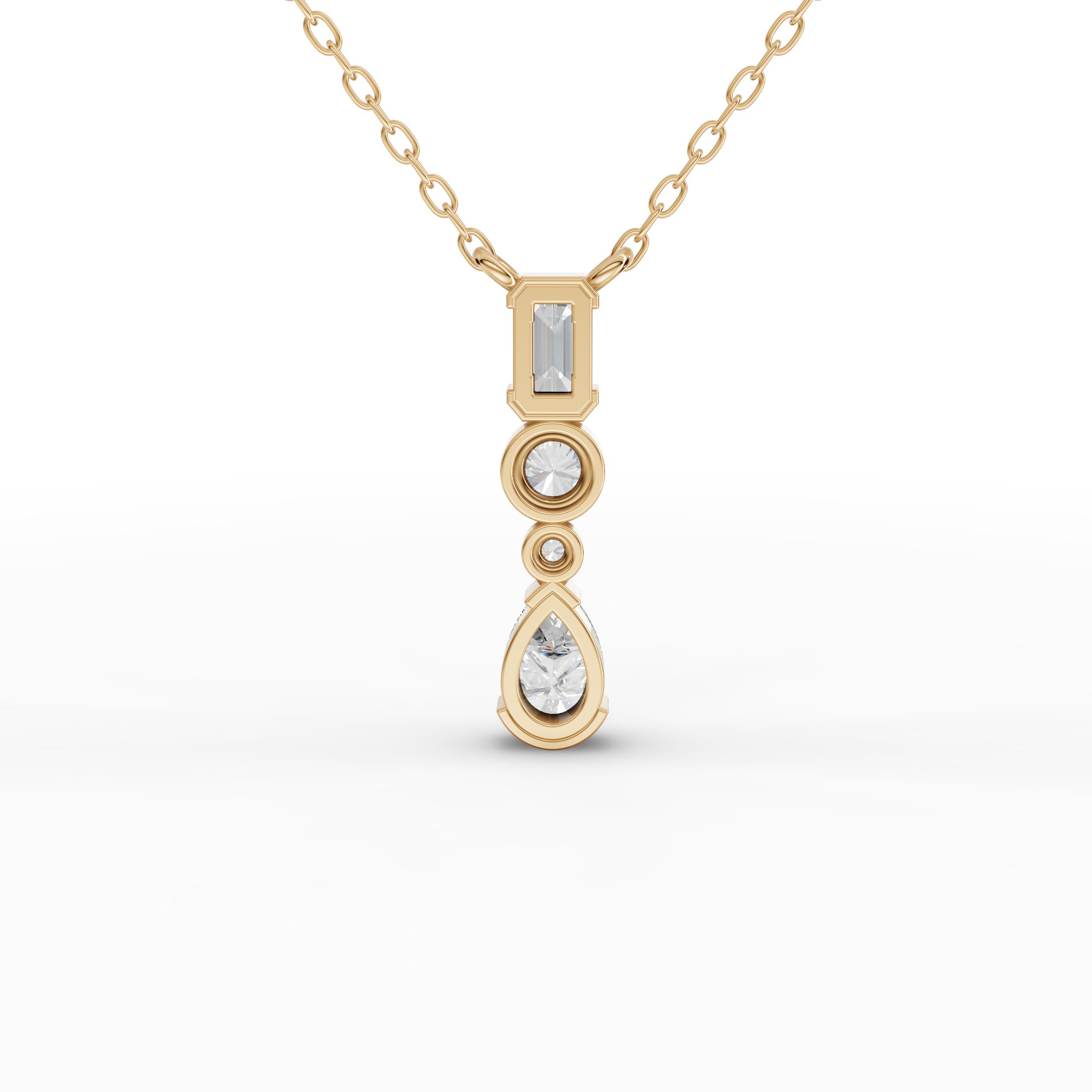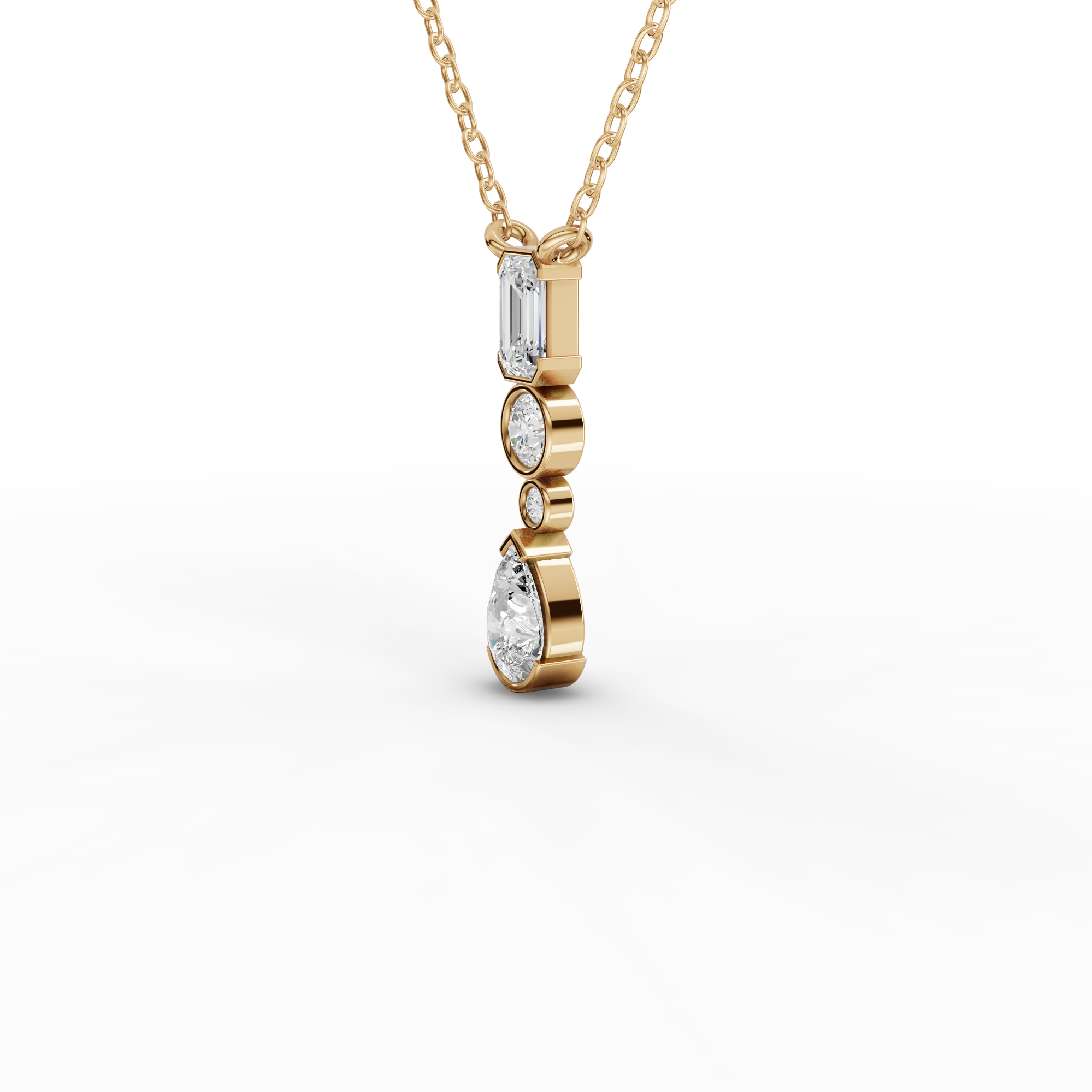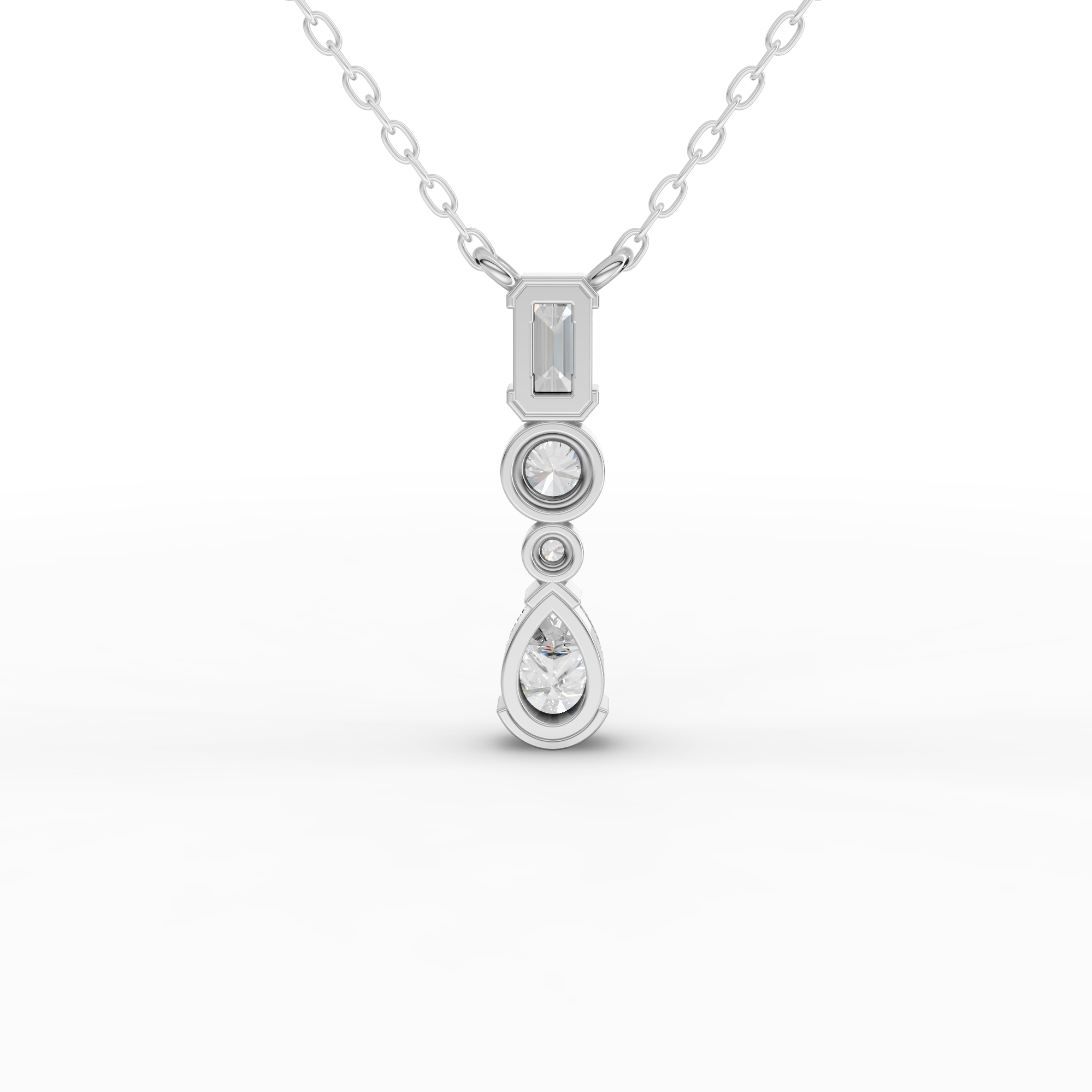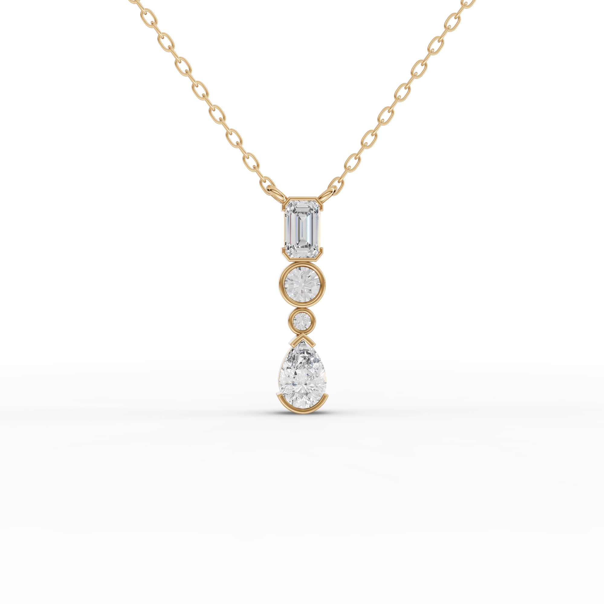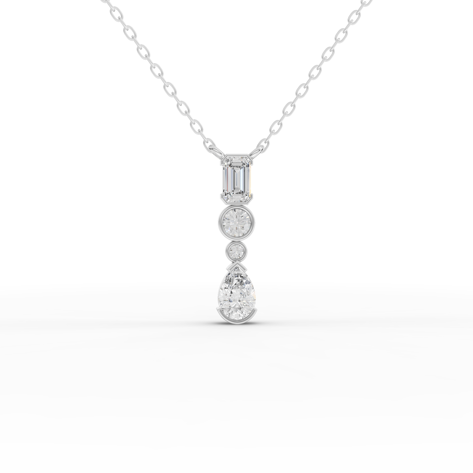 The vertical drop necklace is set with two round lab-grown diamonds totaling approximately 0.11 ct, accented by a striking emerald-cut diamond of approximately 0.26 ct and a pear-shaped diamond weighing approximately 0.35 ct, creating a refined mixed-shape drop silhouette with elegant movement and dimensional sparkle.