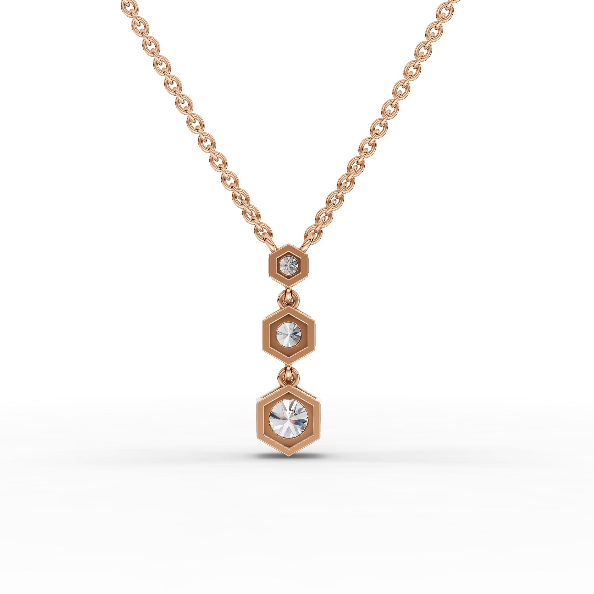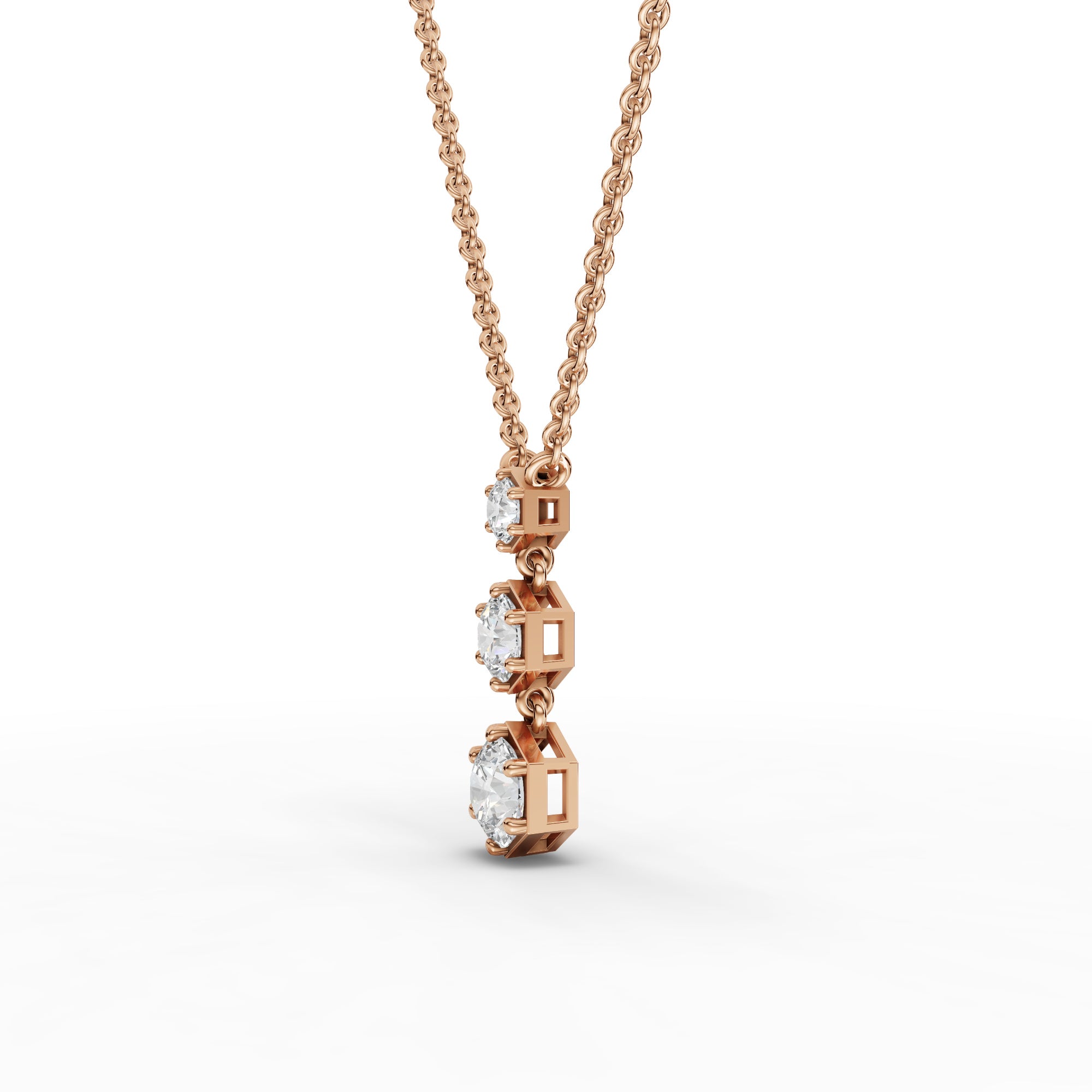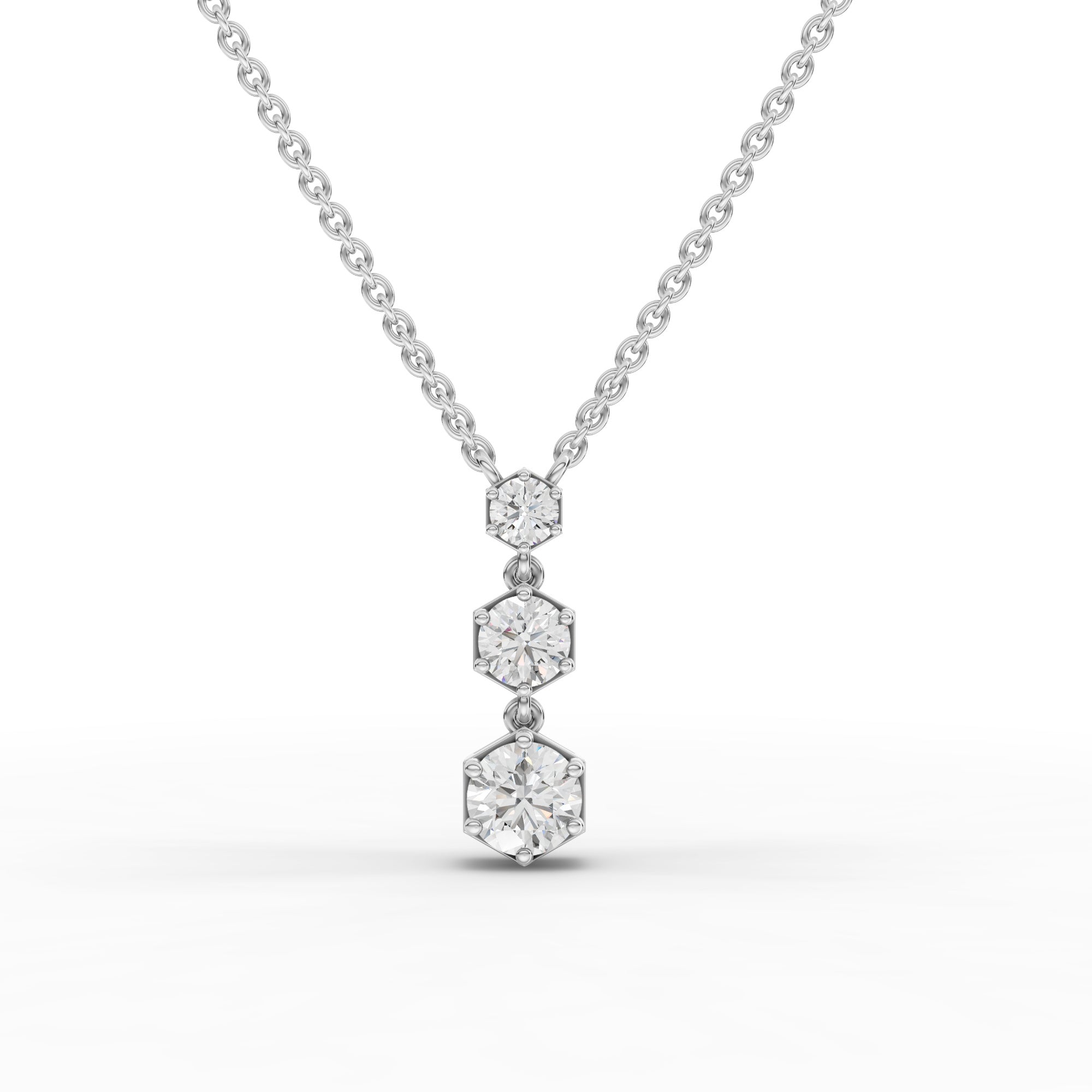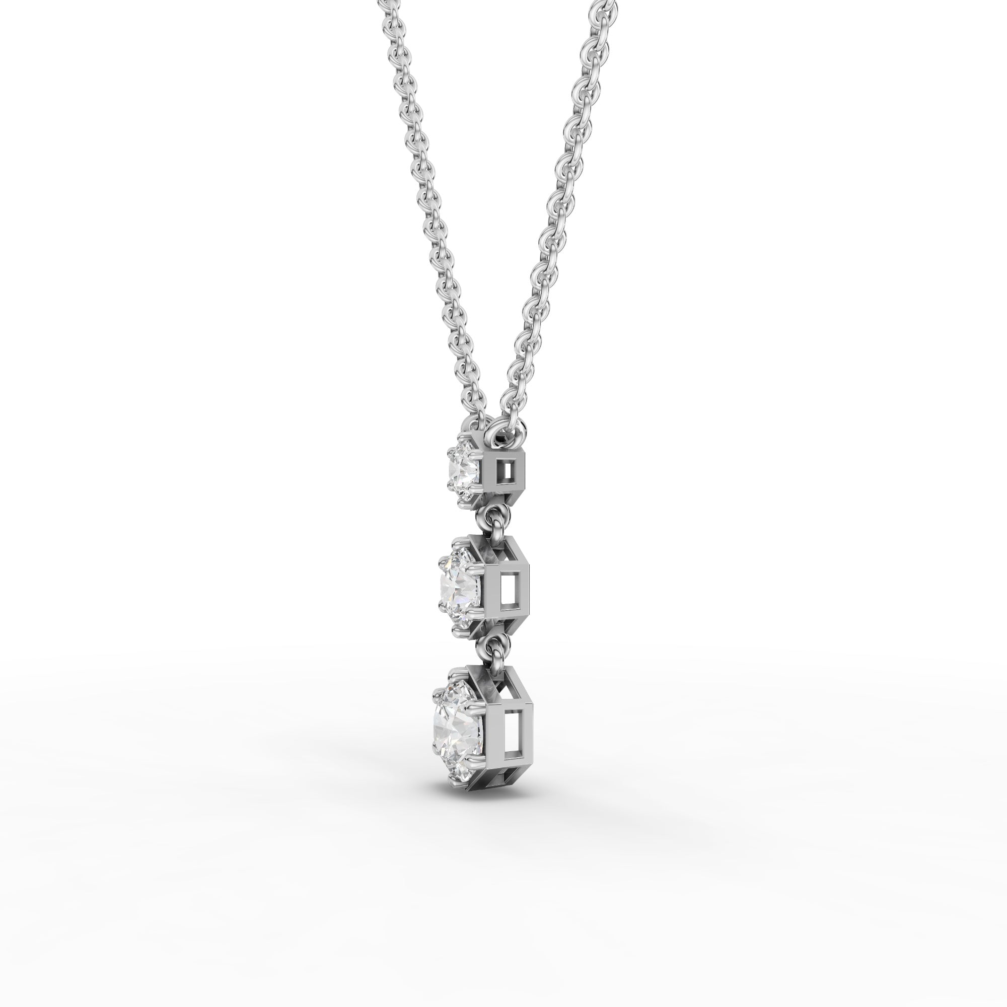 The pendant necklace is set with three round lab-grown diamonds totaling approximately 0.81 ct, arranged to create a balanced geometric drop that reflects light with elegant movement and understated brilliance.