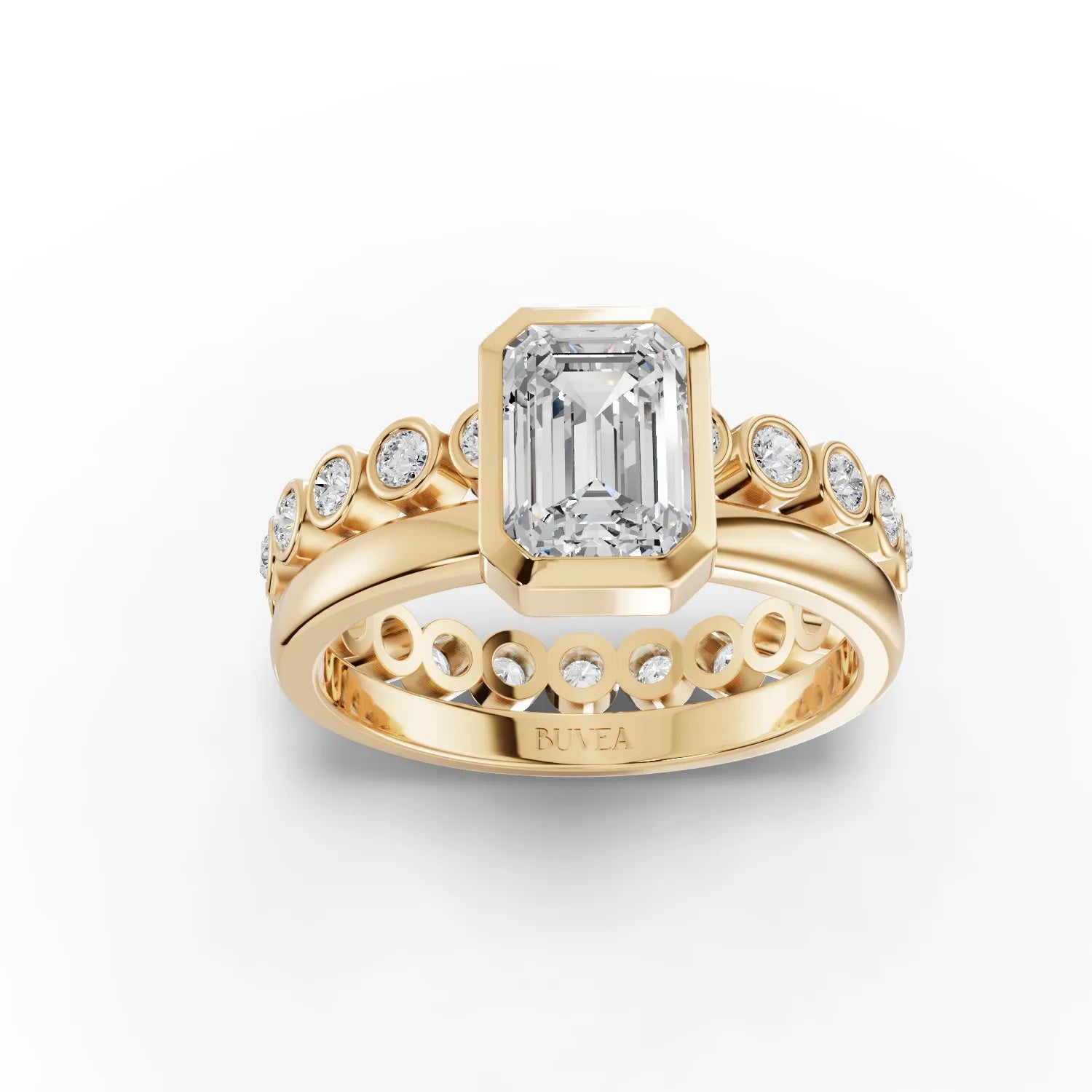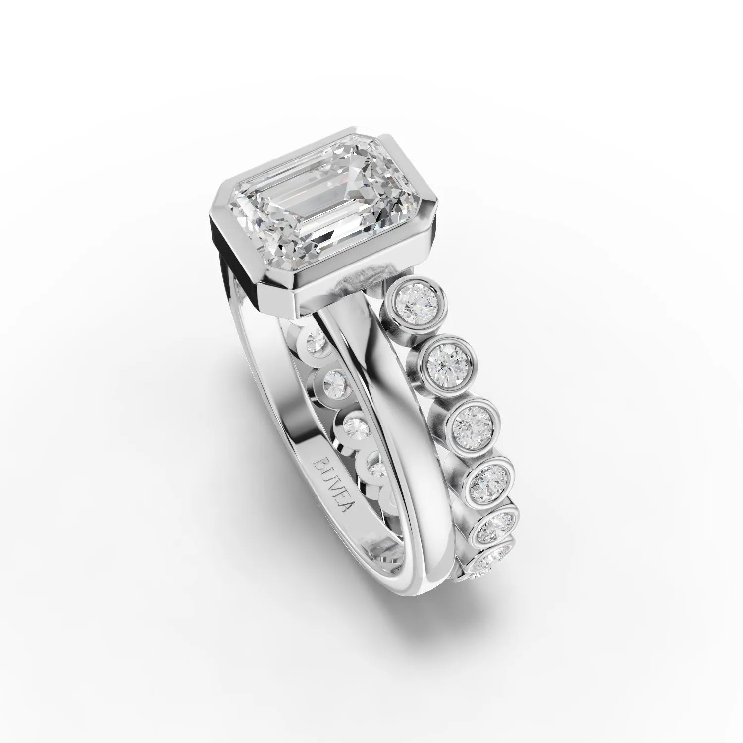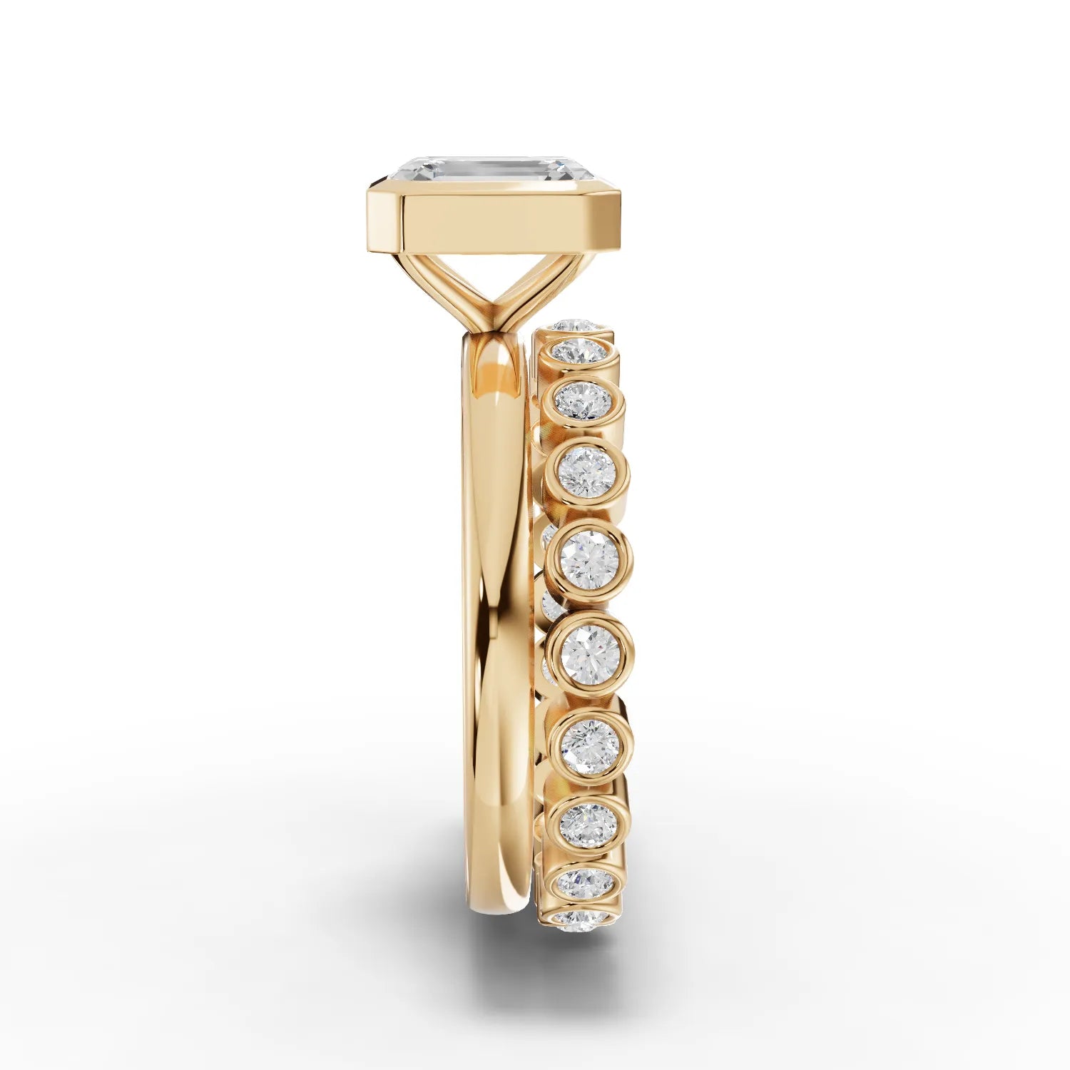 Discover timeless elegance with this sophisticated emerald-cut engagement ring, featuring a striking center stone secured in a refined bezel setting. The sleek metal frame complements the geometric beauty of the emerald cut while providing enhanced protection for your precious stone. Delicate round diamond accents frame the sides, adding brilliant sparkle and dimension to this classic design. Perfect for those who appreciate understated luxury and architectural precision in fine jewelry.