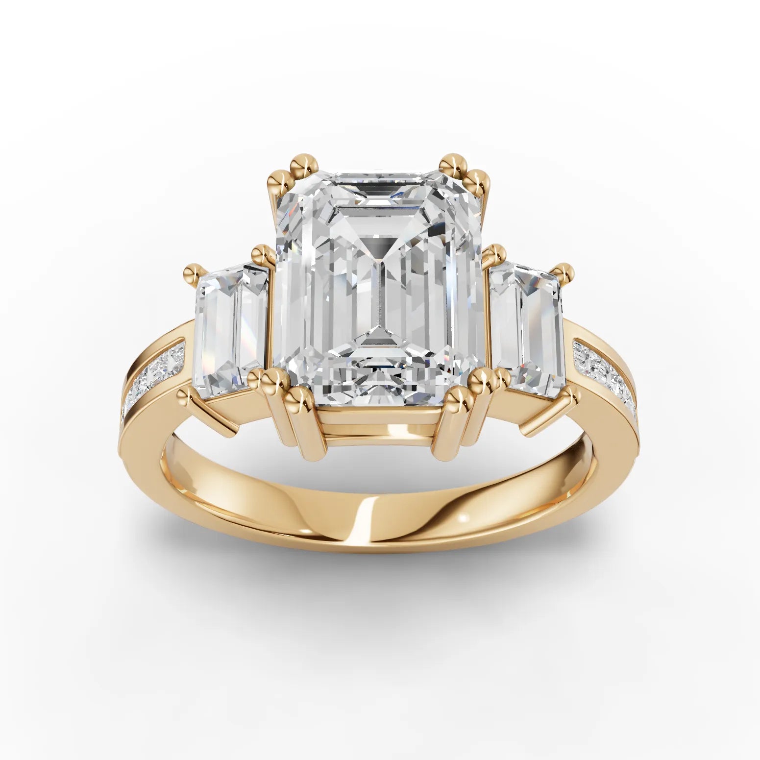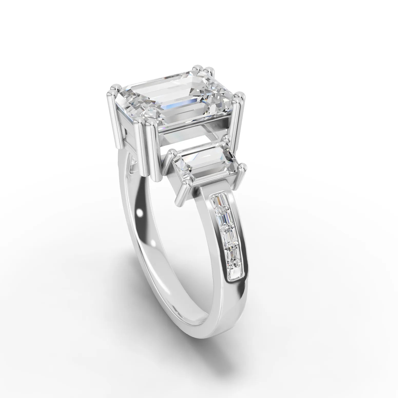 This refined engagement ring showcases a striking emerald cut lab diamond complemented by tapered step-cut side stones that gracefully frame the center stone. The geometric precision of the emerald cut maximizes light reflection through its distinctive facet pattern, while the tapered sides create an elegant visual flow. Lab diamonds deliver superior transparency and consistency—chemically and optically identical to mined diamonds with full certification backing. The step-cut design on both center and sides emphasizes clarity and brilliance, making this piece perfect for those who appreciate architectural sophistication and sustainable luxury in fine jewelry.