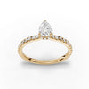 This mesmerizing ring showcases a captivating 0.5 carat pear cut diamond as its radiant centerpiece, exuding an enchanting brilliance that instantly captivates. Held in a sophisticated prong setting, the diamond's unique shape allows light to dance through its facets, enhancing its dazzling sparkle. The band, gracefully adorned with a harmonious array of smaller diamonds, creates a continuous river of light that beautifully complements the central gem's allure. This extraordinary piece masterfully blends timeless sophistication with modern elegance, making it a stunning symbol of enduring love and refined taste. Its ethereal design and luminous presence are sure to enchant and leave a lasting impression on all who behold it.