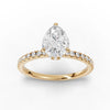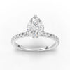 The band structure maintains a smooth transition between the center setting and the accent-set section. The continuous diamond alignment supports consistent visual flow while maintaining the distinct outline of the pear-shaped center stone. The ring profile remains controlled to ensure balanced wear and structural stability.