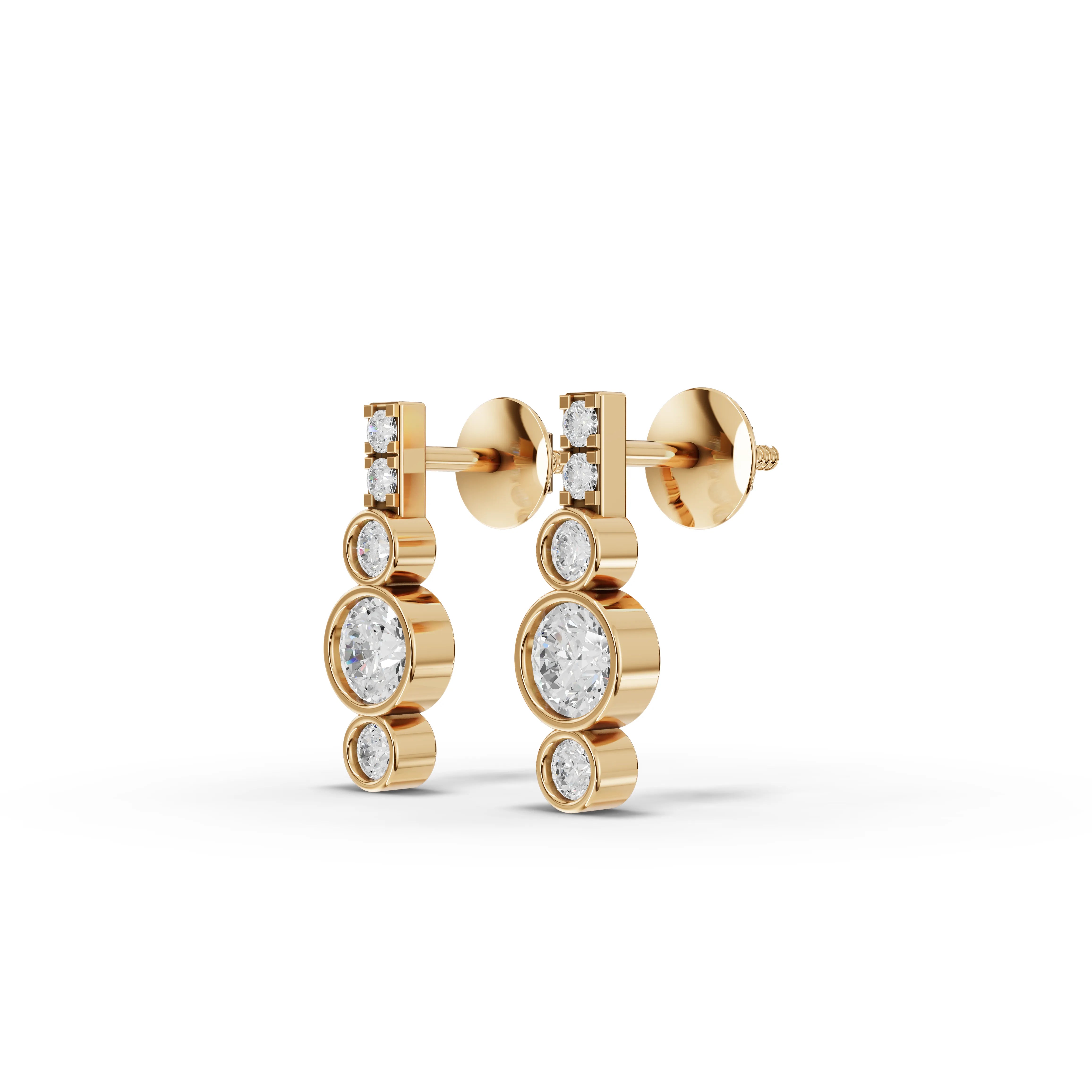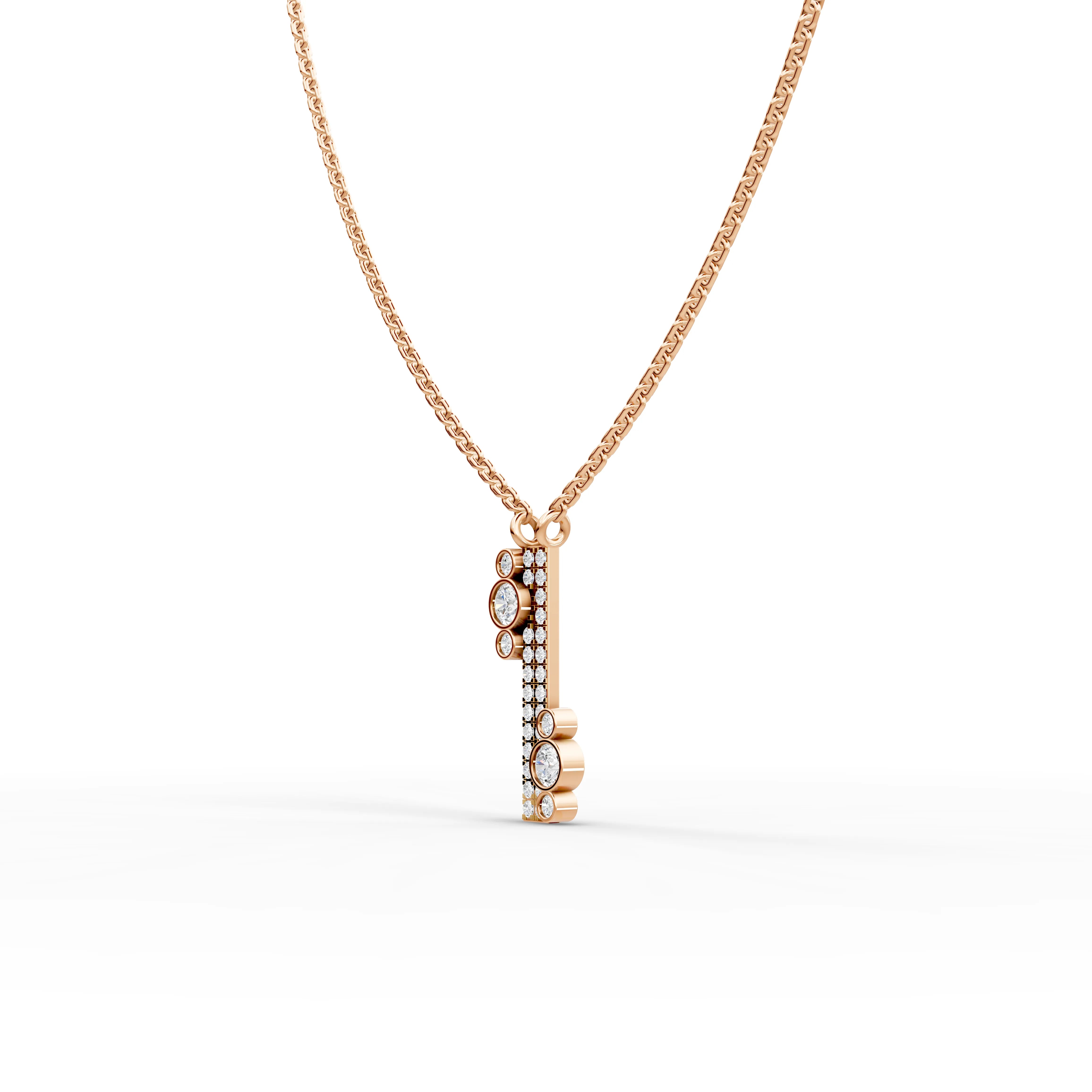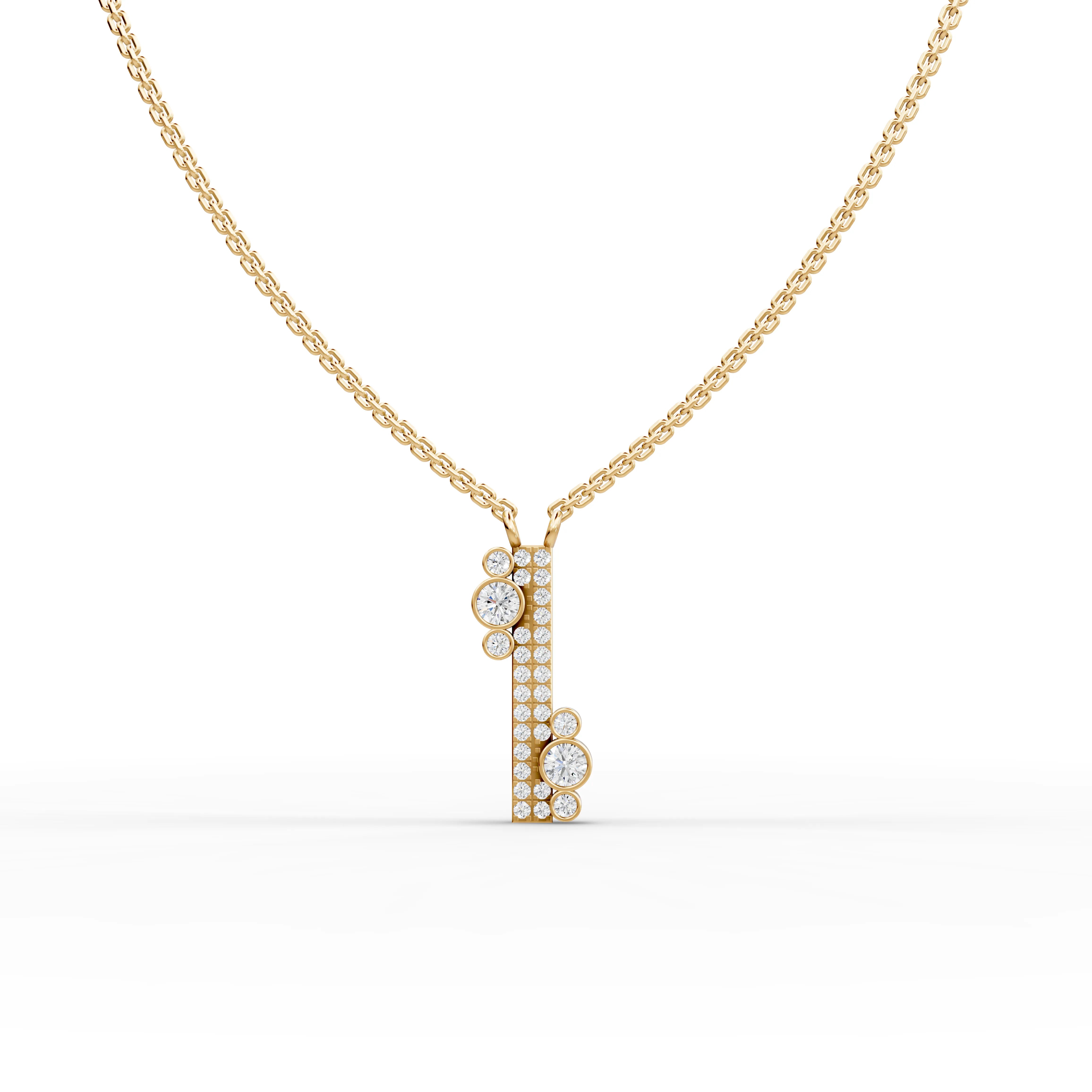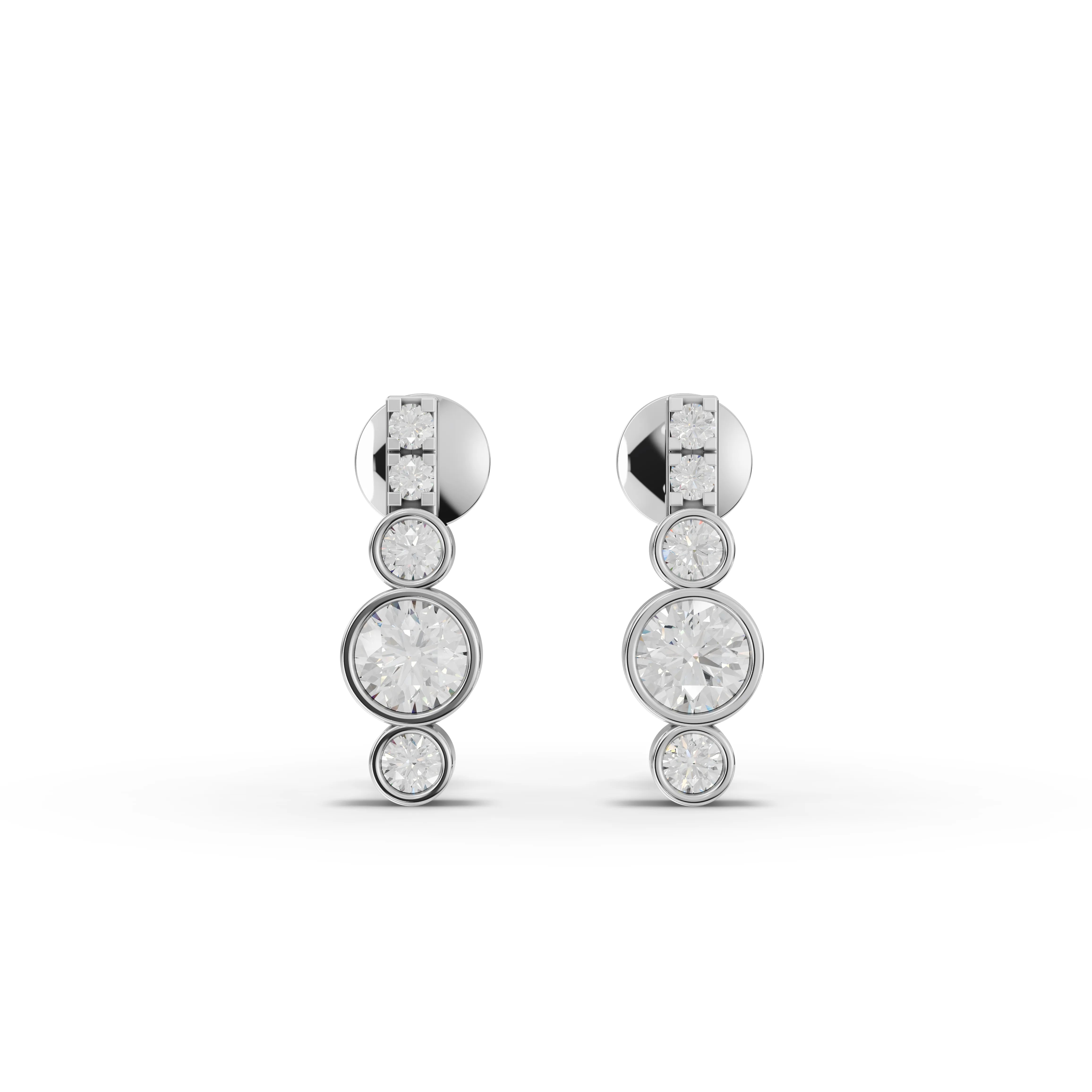 Across the three pieces, a total of seventy round lab-grown diamonds with a combined approximate weight of 1.39 carats are precisely set to create balance, dimension, and light reflection. The asymmetrical bar pendant offers a sleek focal point, while the bezel drop earrings introduce elegant movement through accent-set diamonds. The multi-row pavé band ring completes the look with layered sparkle and refined structure, enhanced by bezel-set details for added depth.