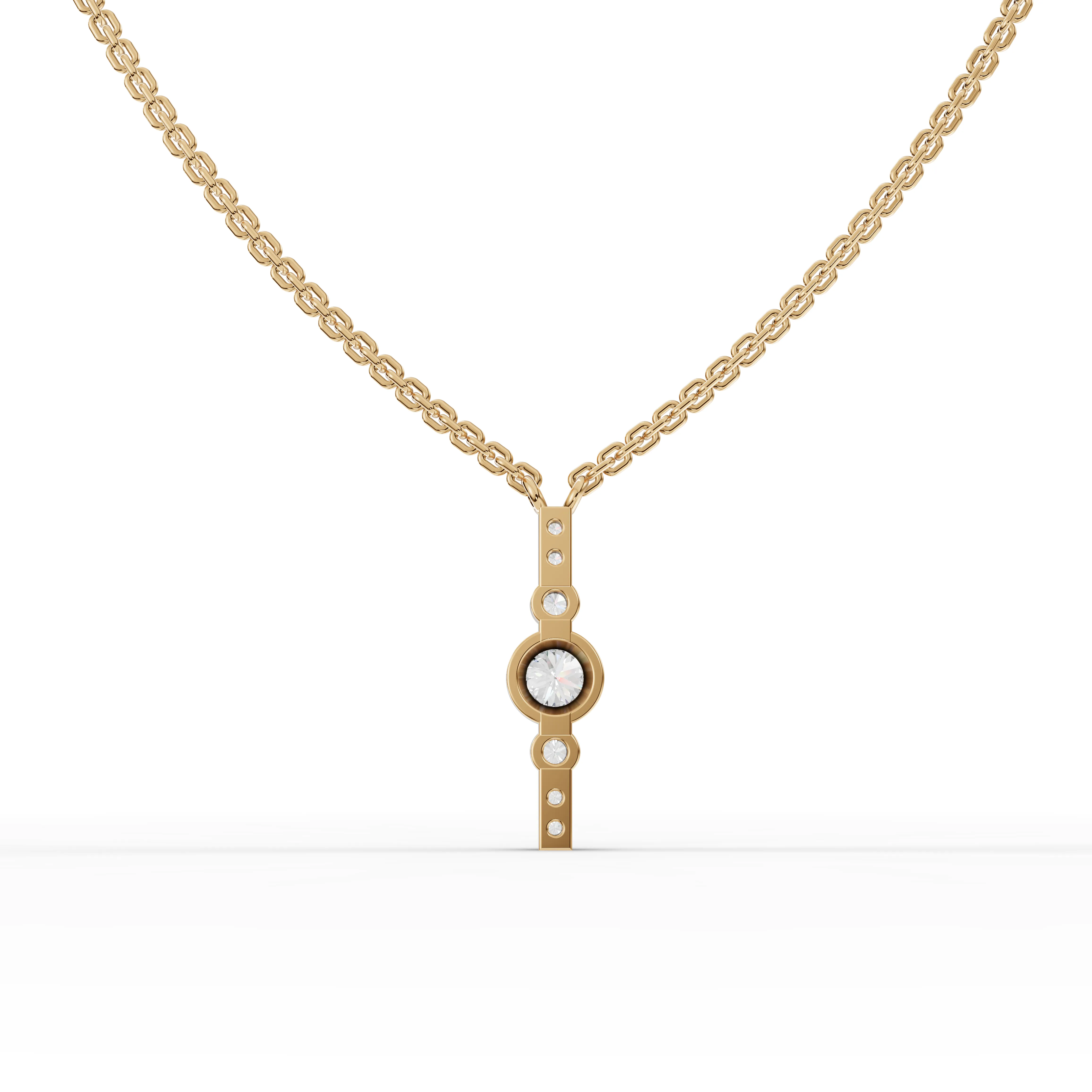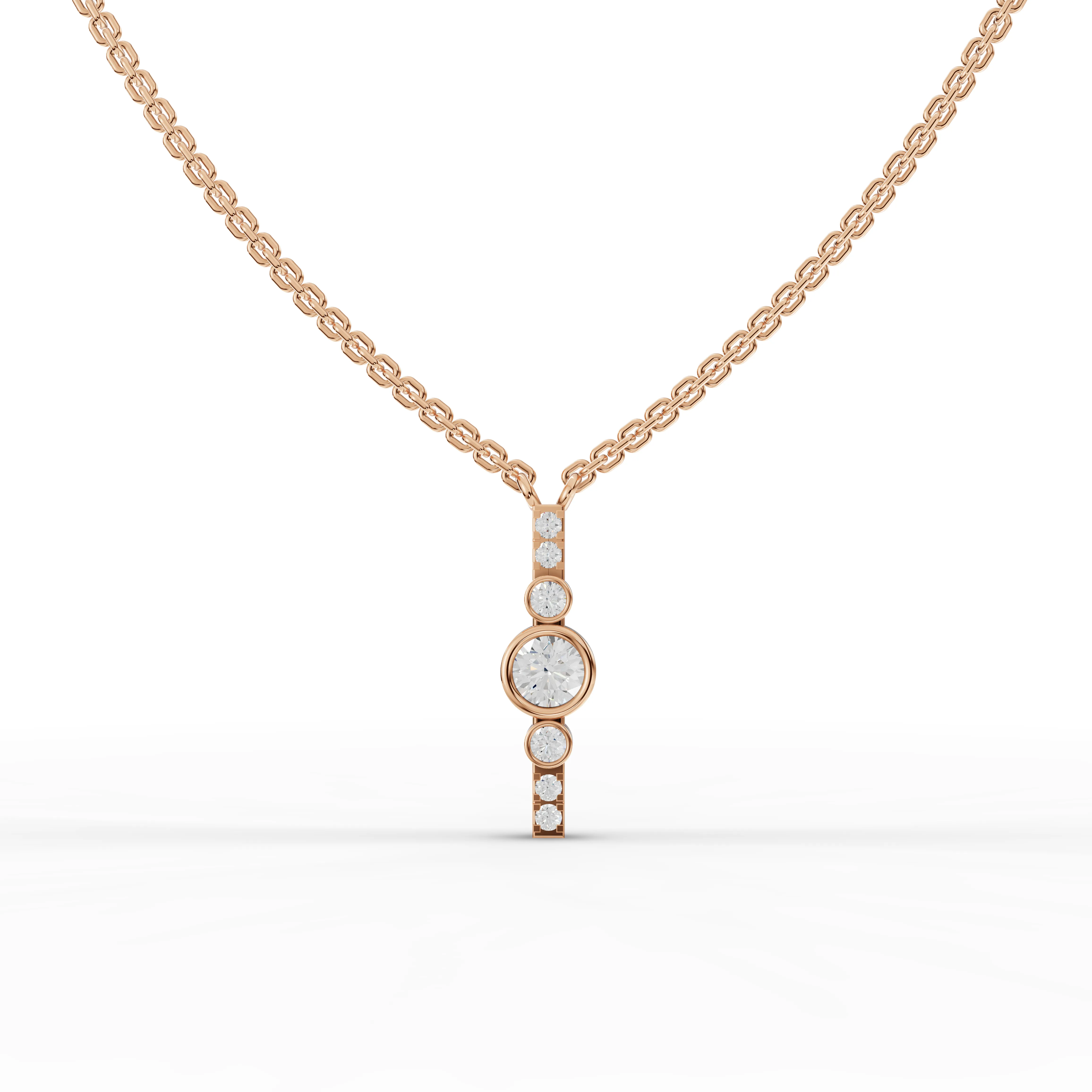 The bezel center bar pendant features a round lab-grown diamond weighing approximately 0.24 ct, accented by six round bezel-set diamonds totaling approximately 0.11 ct, creating a sleek yet luminous focal point. The coordinating drop earrings showcase two round lab-grown center diamonds with a combined weight of approximately 0.48 ct, enhanced by eight round accent diamonds totaling approximately 0.17 ct for added sparkle and elegant movement.