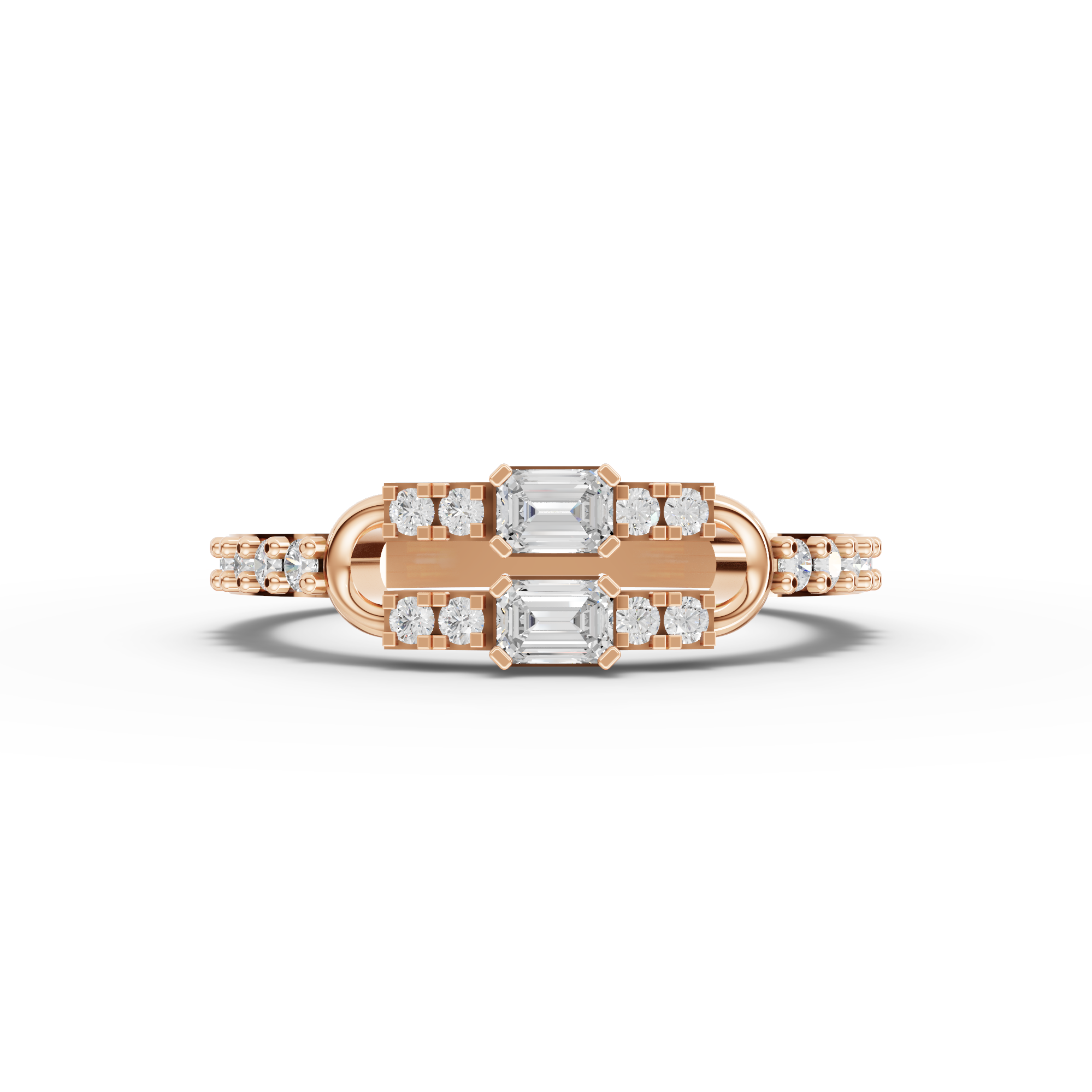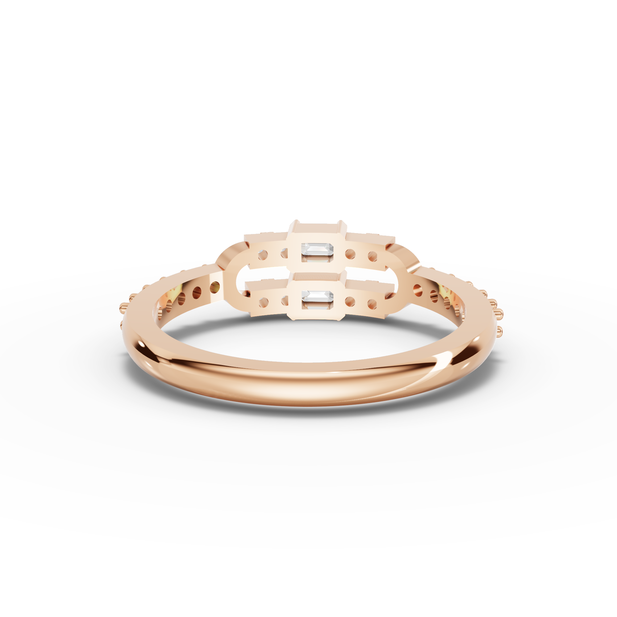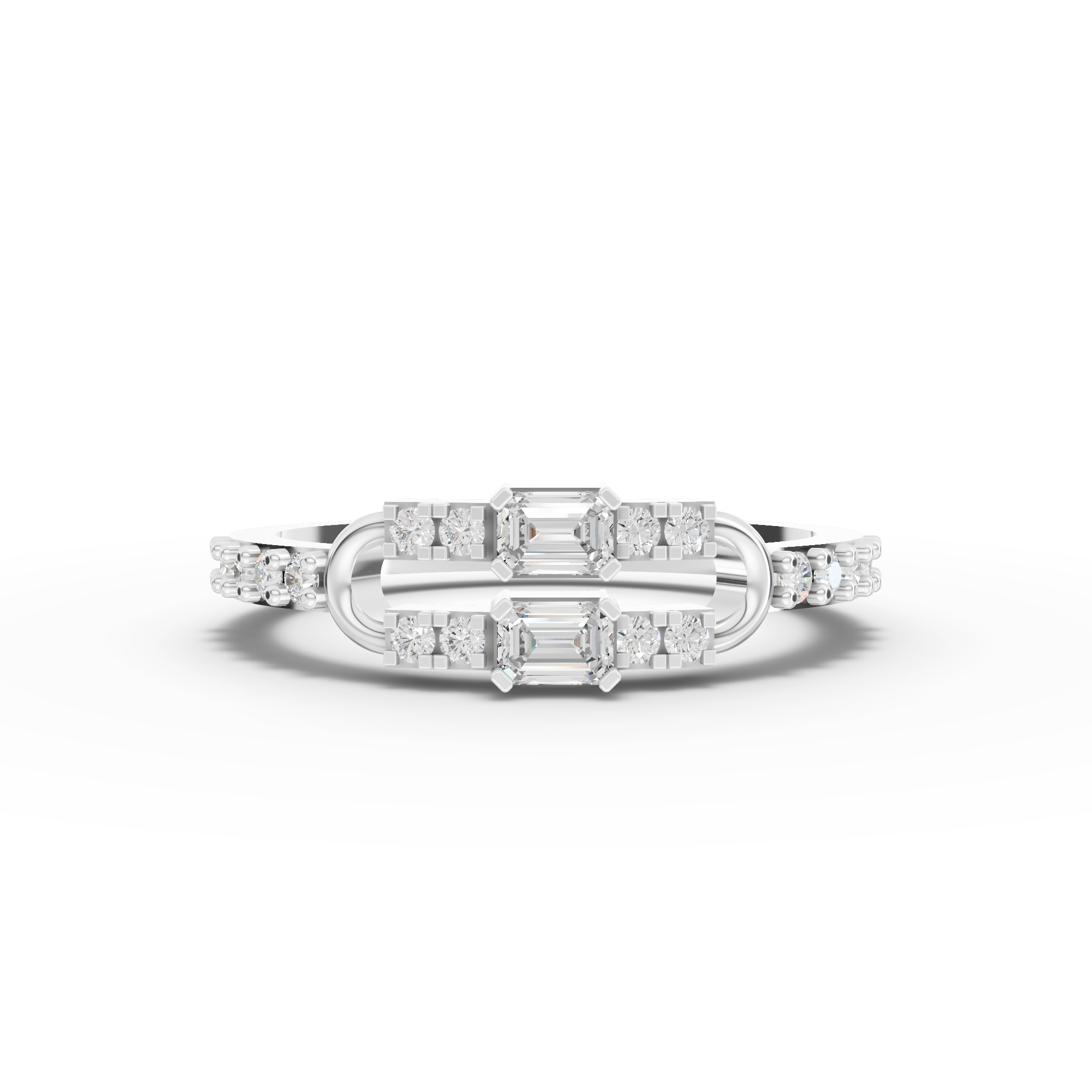 The ring showcases two emerald-cut lab-grown diamonds totaling approximately 0.18 ct, complemented by eighteen round lab-grown diamonds with a combined approximate weight of 0.20 ct. The pavé detailing adds refined texture and continuous shimmer along the band while preserving a sleek, wearable profile.
