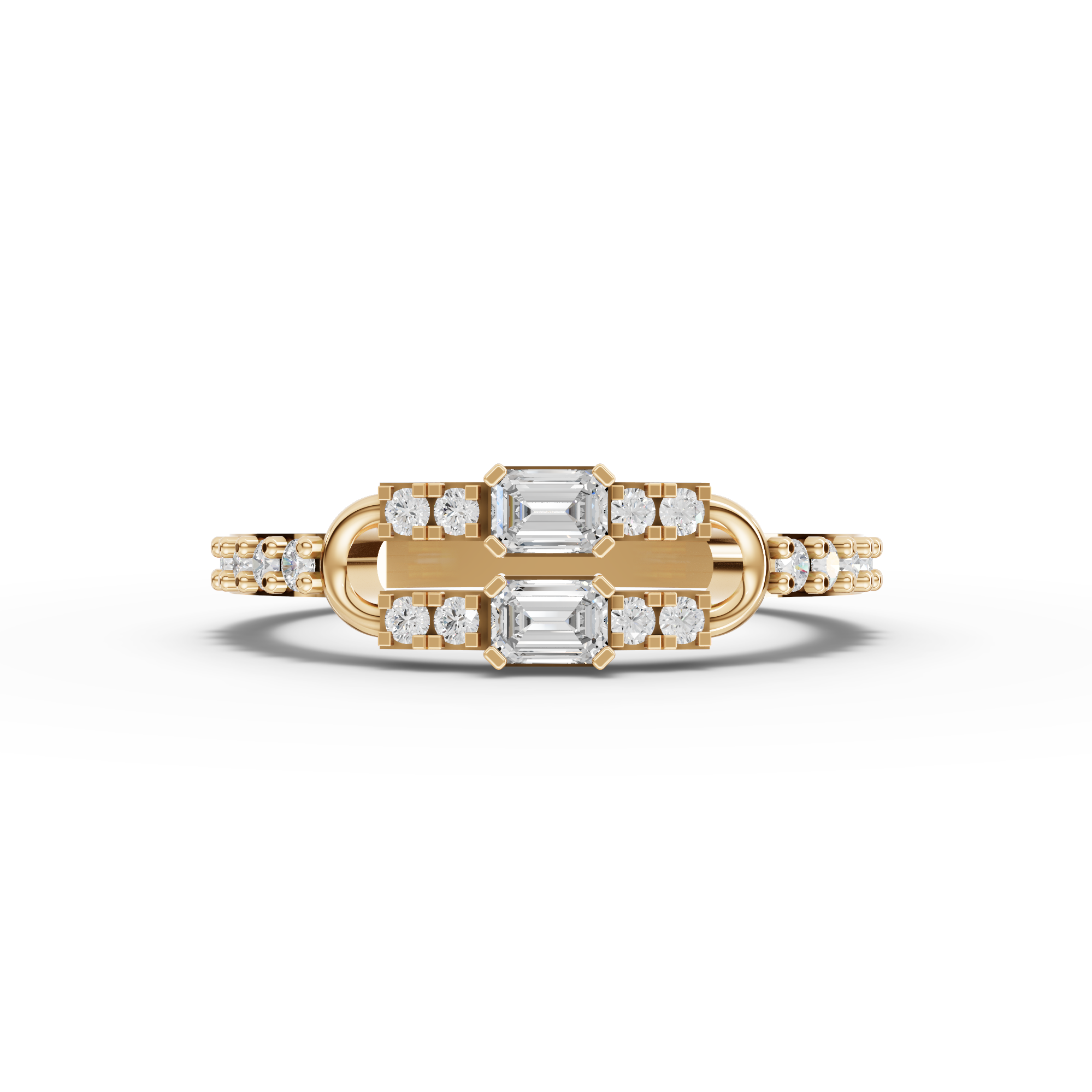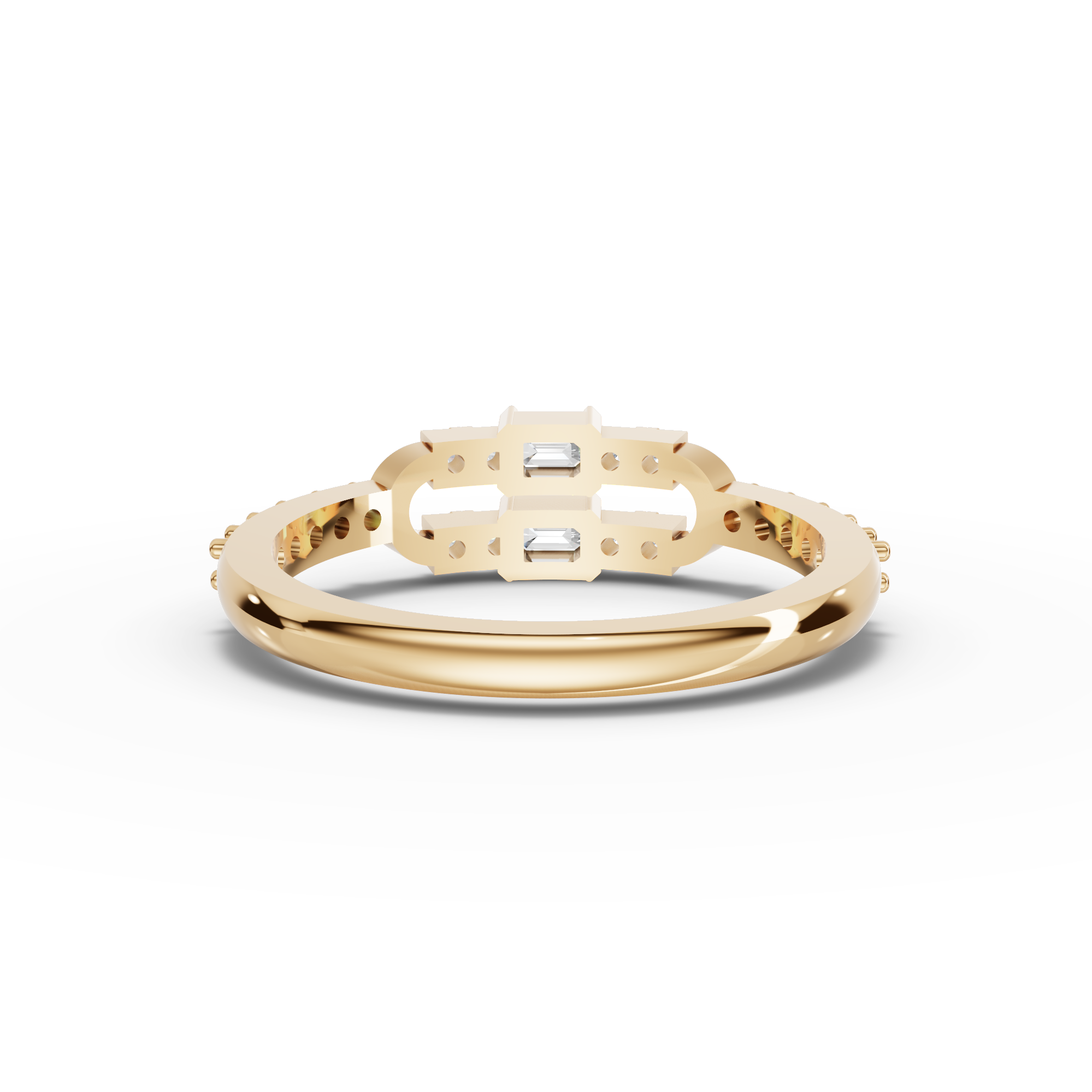 The ring showcases two emerald-cut lab-grown diamonds totaling approximately 0.18 ct, complemented by eighteen round lab-grown diamonds with a combined approximate weight of 0.20 ct. The pavé detailing adds refined texture and continuous shimmer along the band while preserving a sleek, wearable profile.