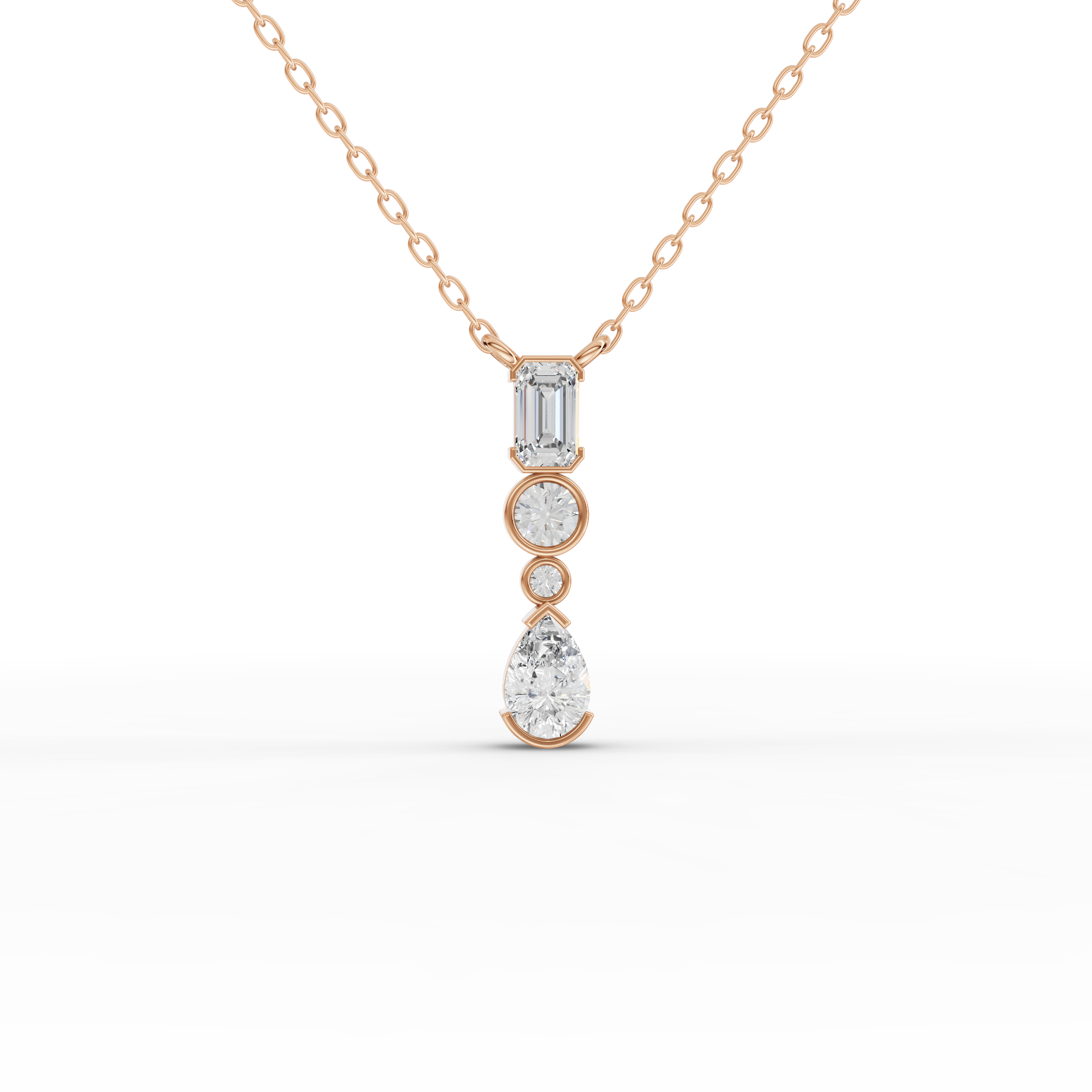 Lab-grown diamonds offer exceptional brilliance and ethical sourcing without compromising on quality or sparkle. This vertical drop necklace combines three distinct diamond shapes—emerald, round, and pear—creating a sophisticated, dynamic silhouette that catches light from every angle. The mixed-shape design adds visual interest while maintaining elegant balance, making it versatile enough for everyday wear or special occasions. Crafted with precision, each stone is selected for clarity and radiance, delivering luxury that's both conscious and timeless.