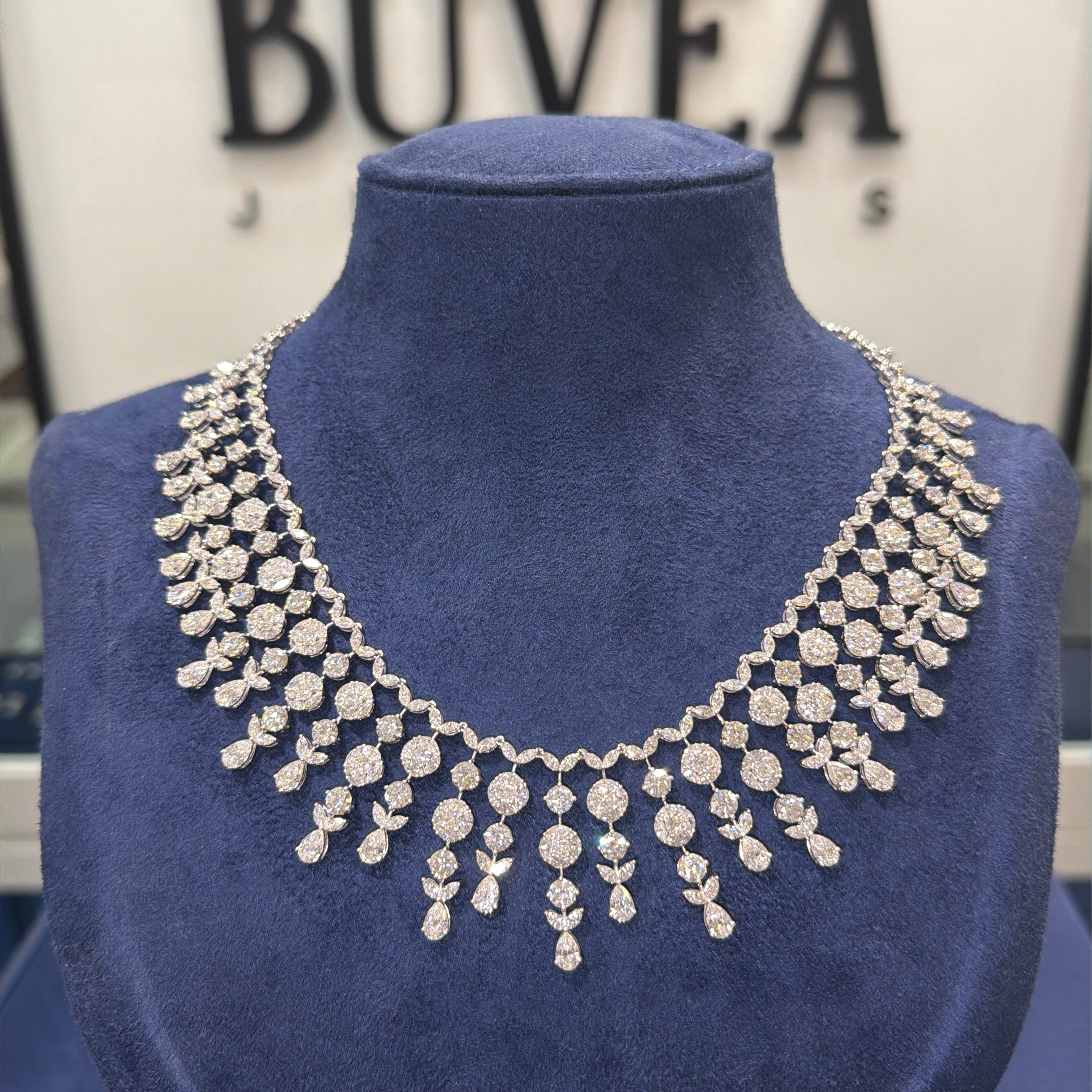 Lab grown diamonds offer exceptional brilliance and clarity at a fraction of traditional diamond costs, making luxury accessible without compromise. This statement choker necklace features a striking centerpiece that commands attention while maintaining elegant sophistication. The secure choker length sits perfectly at the collarbone, creating a refined focal point for any occasion. Crafted with precision, each lab grown stone is chemically identical to mined diamonds, delivering the same sparkle and durability. Perfect for those who value both ethical sourcing and timeless style, this piece transitions effortlessly from evening wear to elevated everyday elegance.