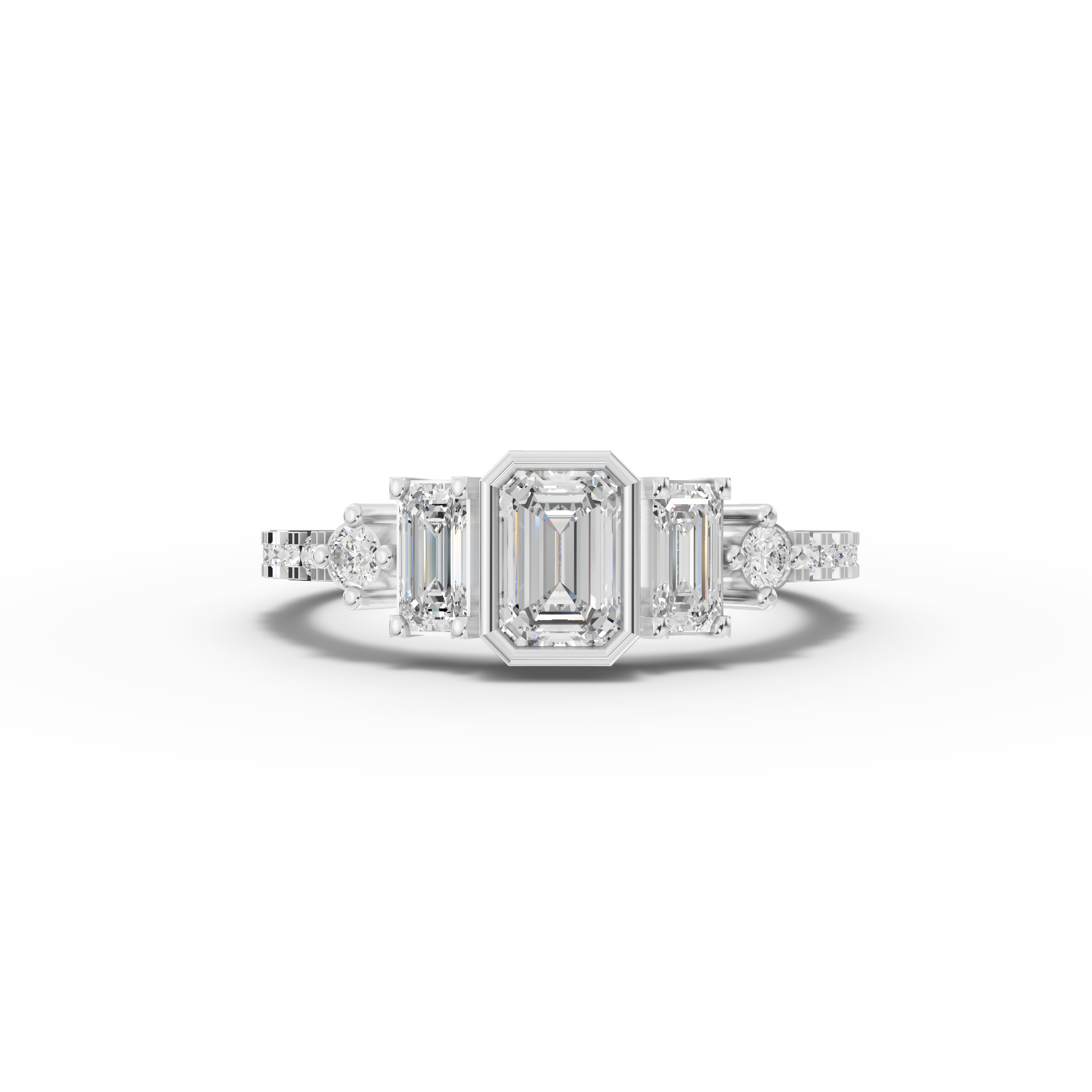 The ring showcases an emerald-cut lab-grown diamond weighing approximately 0.43 ct as its focal point, enhanced by twelve emerald-cut lab-grown diamonds totaling approximately 0.14 ct and two round lab-grown accent diamonds with a combined approximate weight of 0.23 ct. The layered detailing adds architectural depth and continuous sparkle while preserving a sleek, elegant profile.