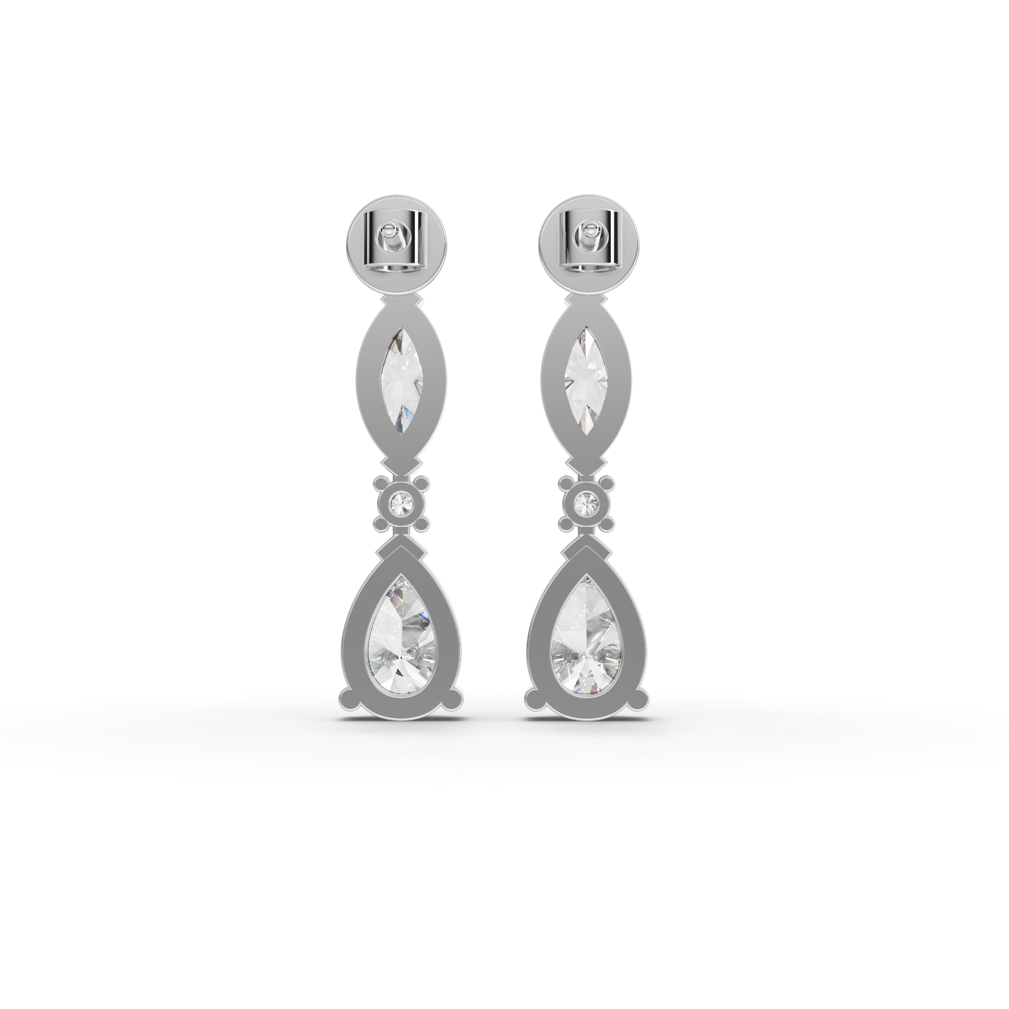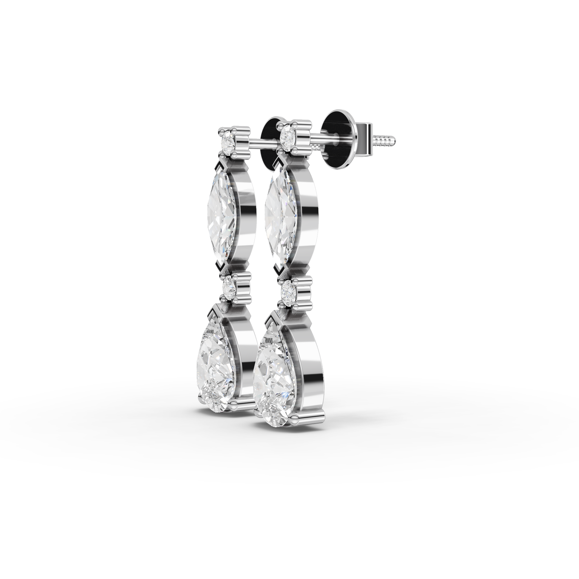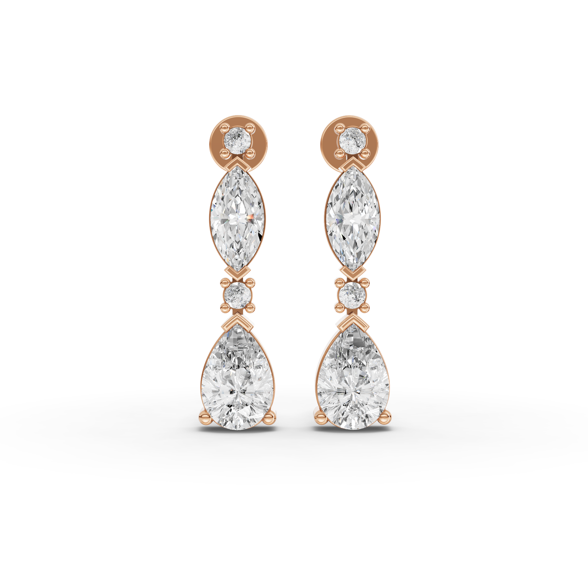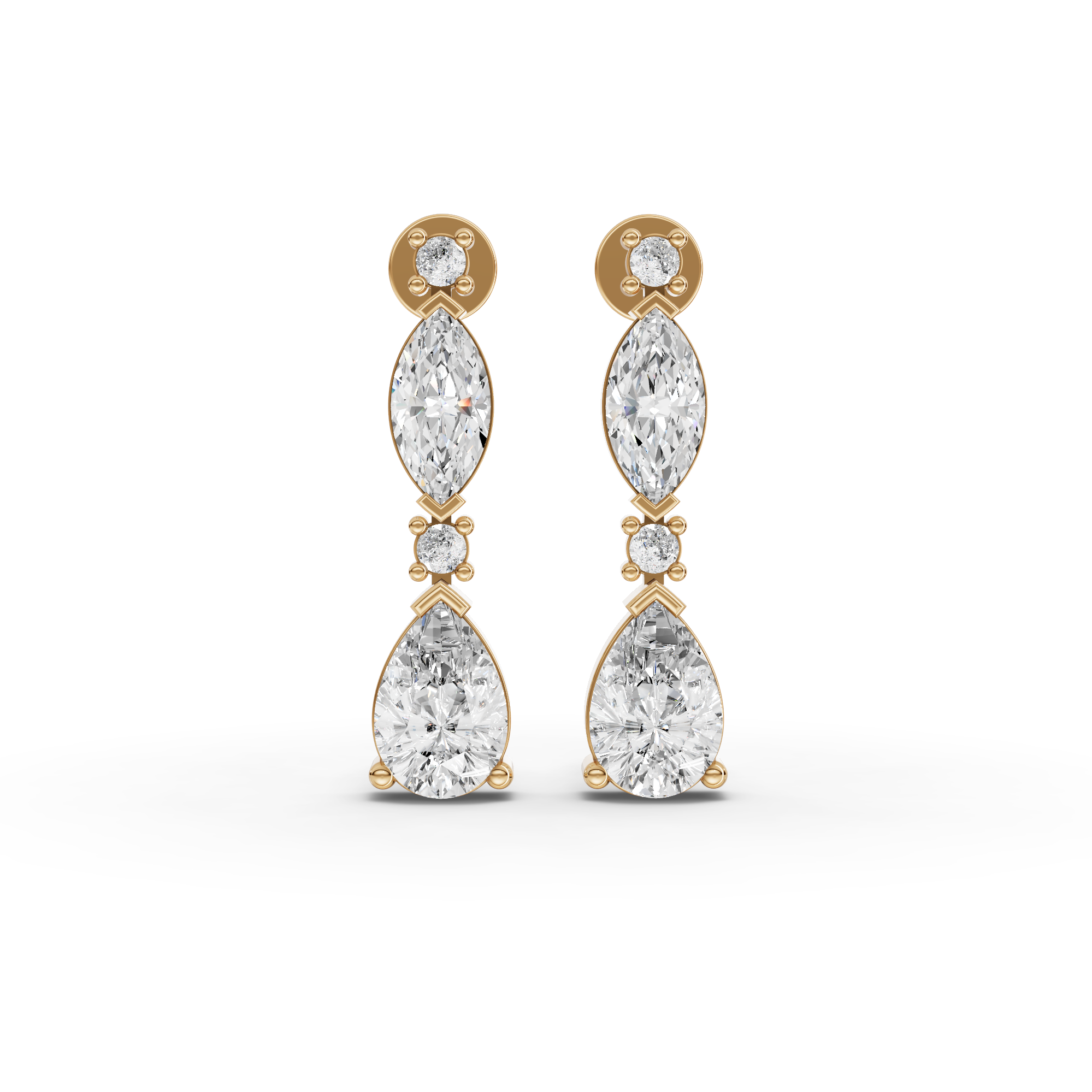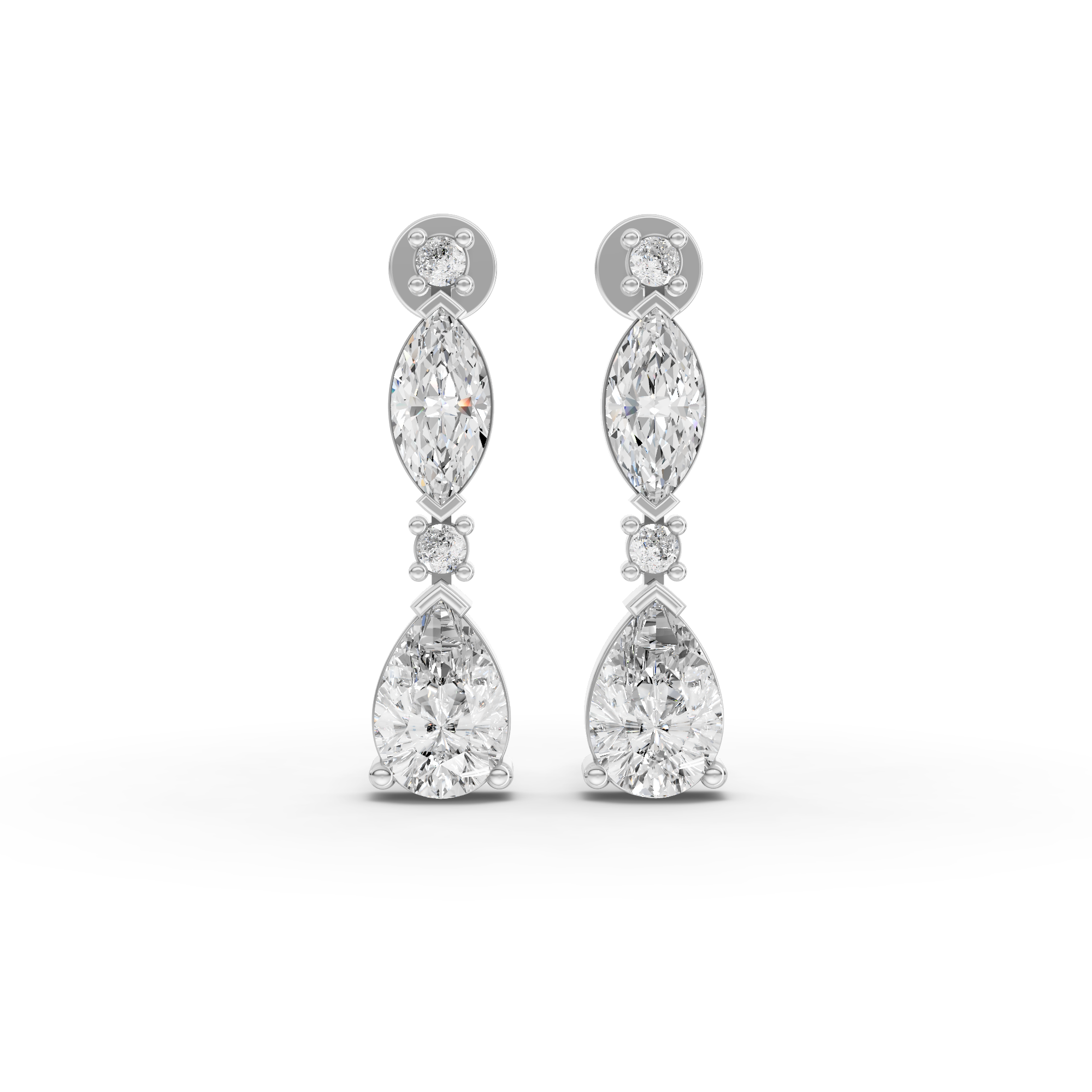 Lab-grown diamonds offer exceptional brilliance with environmental responsibility. These graduated drop earrings feature a sophisticated combination of marquise and pear-cut stones, creating elegant movement and dimension. The carefully calibrated sizing draws the eye downward, enhancing facial features with refined sparkle. Perfect for both everyday sophistication and special occasions, these earrings deliver luxury appeal without compromise. Each stone is conflict-free and lab-created to exacting standards, ensuring superior quality and ethical sourcing for the discerning jeweler.