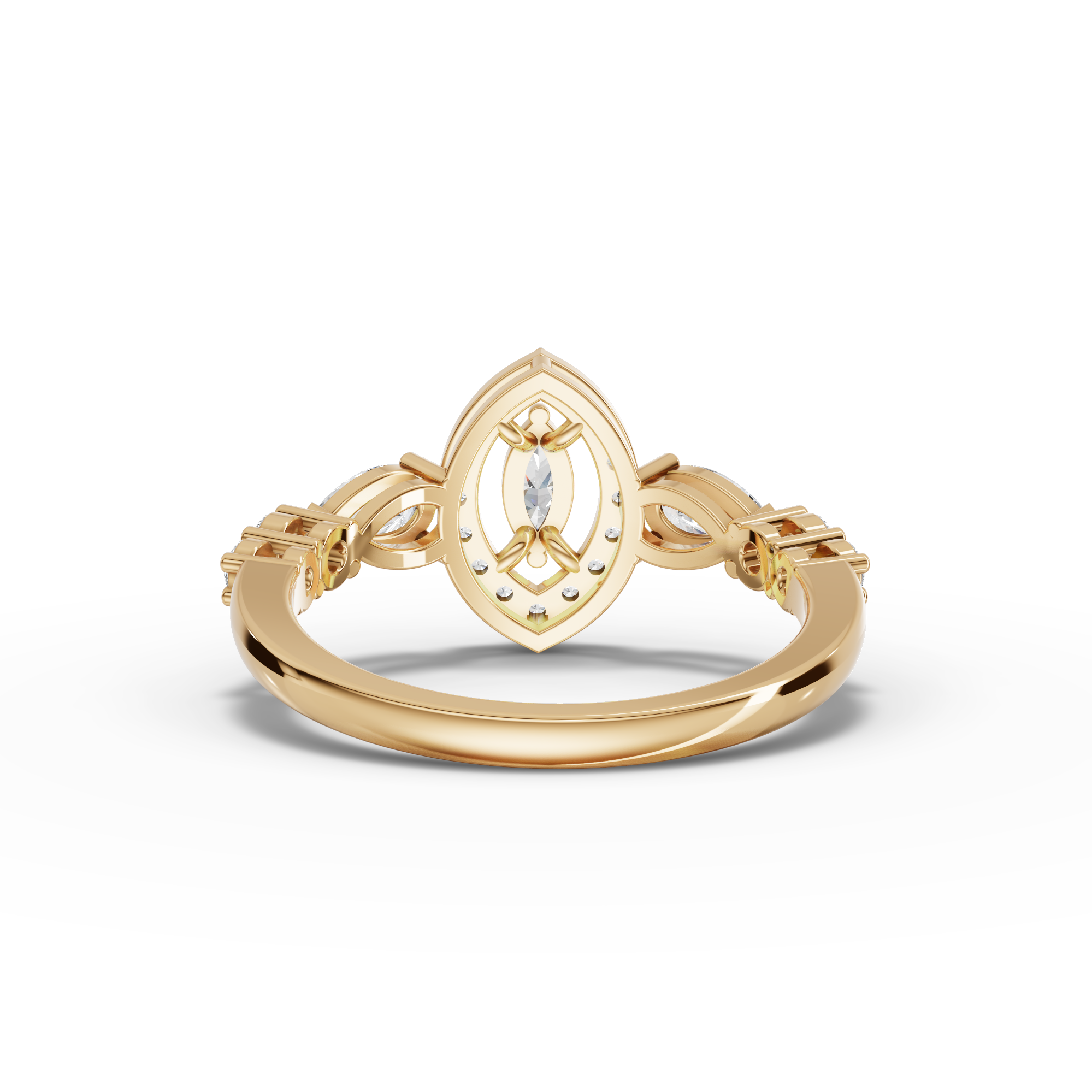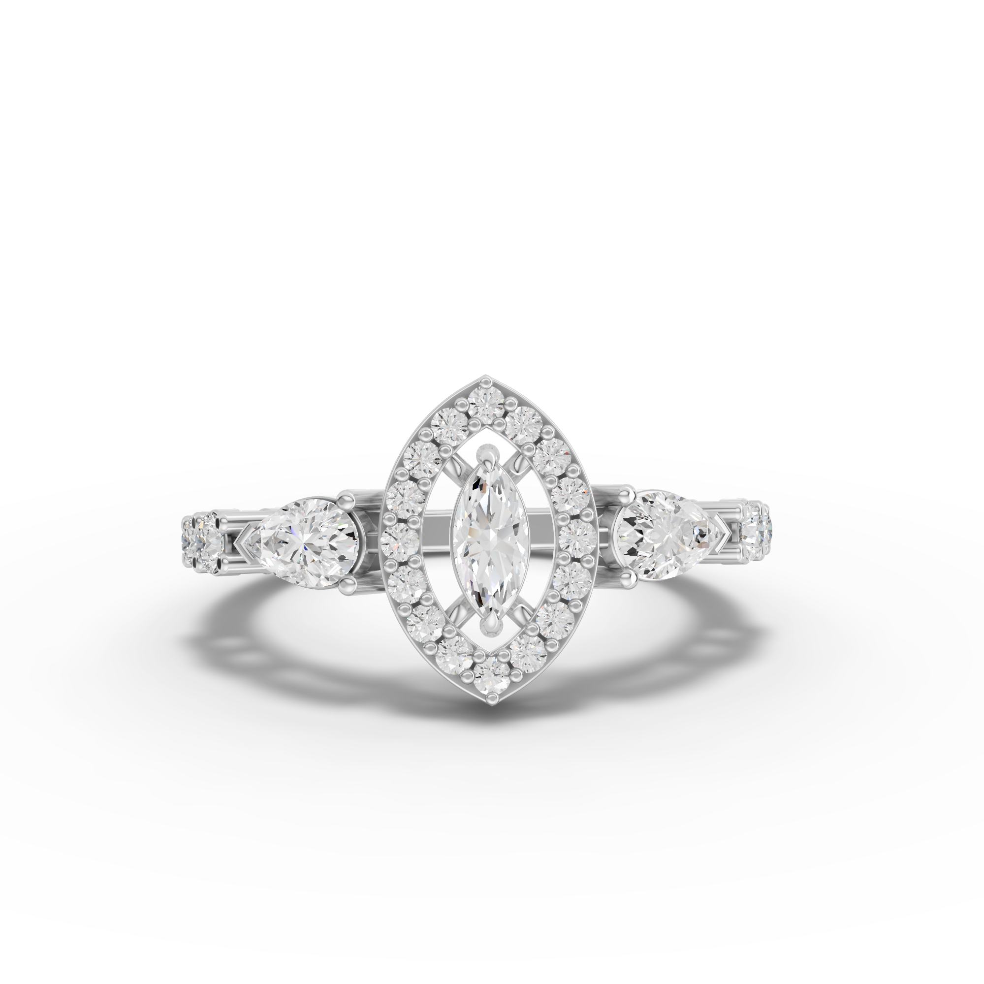 Lab-grown diamonds offer exceptional brilliance with environmental responsibility. This pear-shaped centerpiece showcases sophisticated geometry through hexagon accent stones that frame the stone with modern precision. The pavé band features meticulously set smaller diamonds that catch light from every angle, creating continuous sparkle along your finger. The open wrap design provides an elegant, contemporary silhouette while allowing maximum light penetration through the stone. Perfect for those seeking distinctive design paired with ethical sourcing and lasting radiance.
