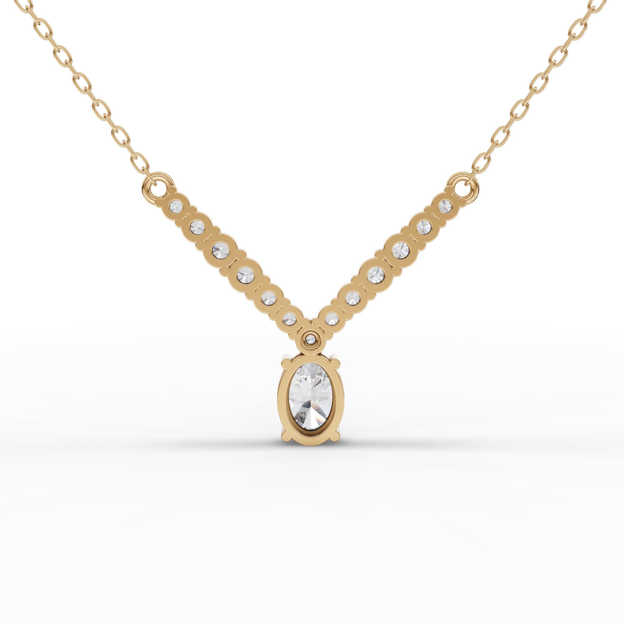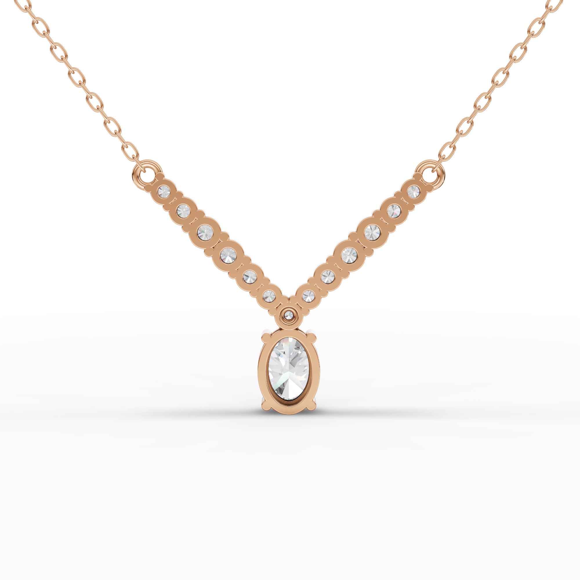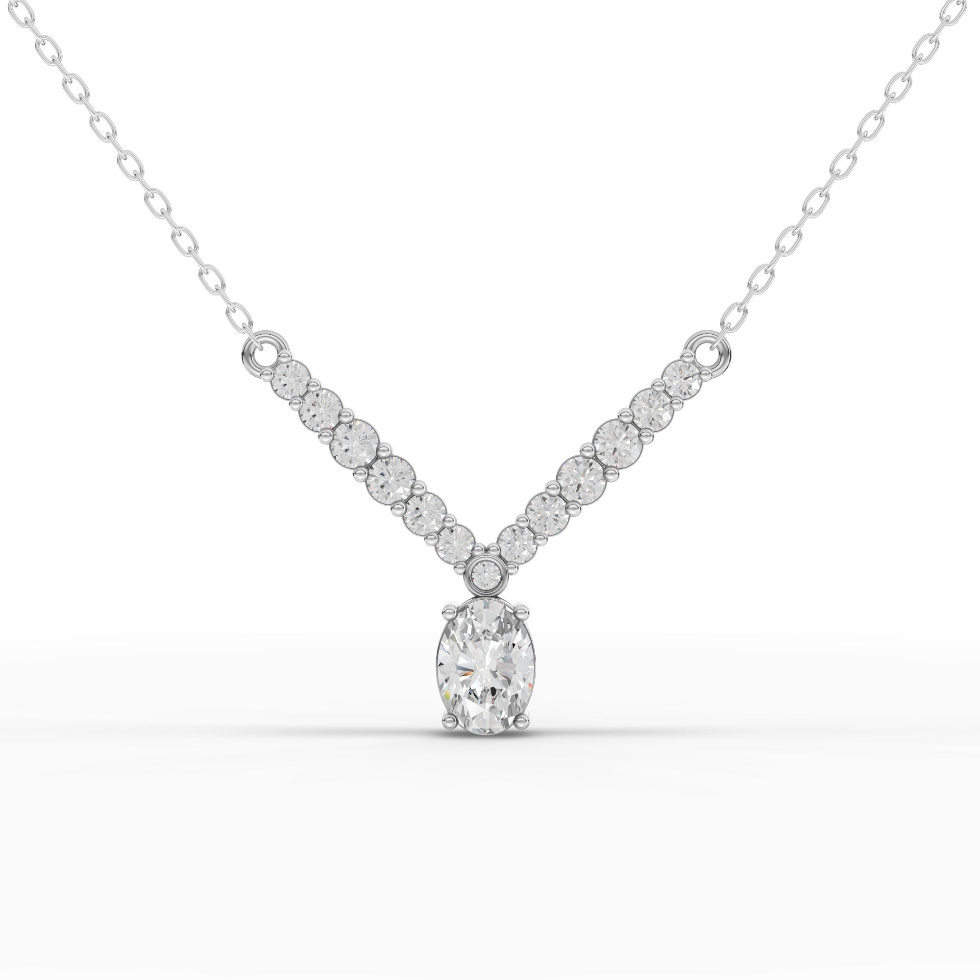 Elevate your elegance with this sophisticated oval lab-grown diamond graduated drop necklace. Featuring ethically sourced diamonds that descend gracefully in size, this piece combines timeless design with modern consciousness. The lab-grown diamonds offer exceptional brilliance and clarity while maintaining the same physical and optical properties as mined diamonds. Perfect for both everyday refinement and special occasions, this necklace makes a striking statement without compromise. Crafted with precision and attention to detail, it's an investment in sustainable luxury that reflects your discerning taste.