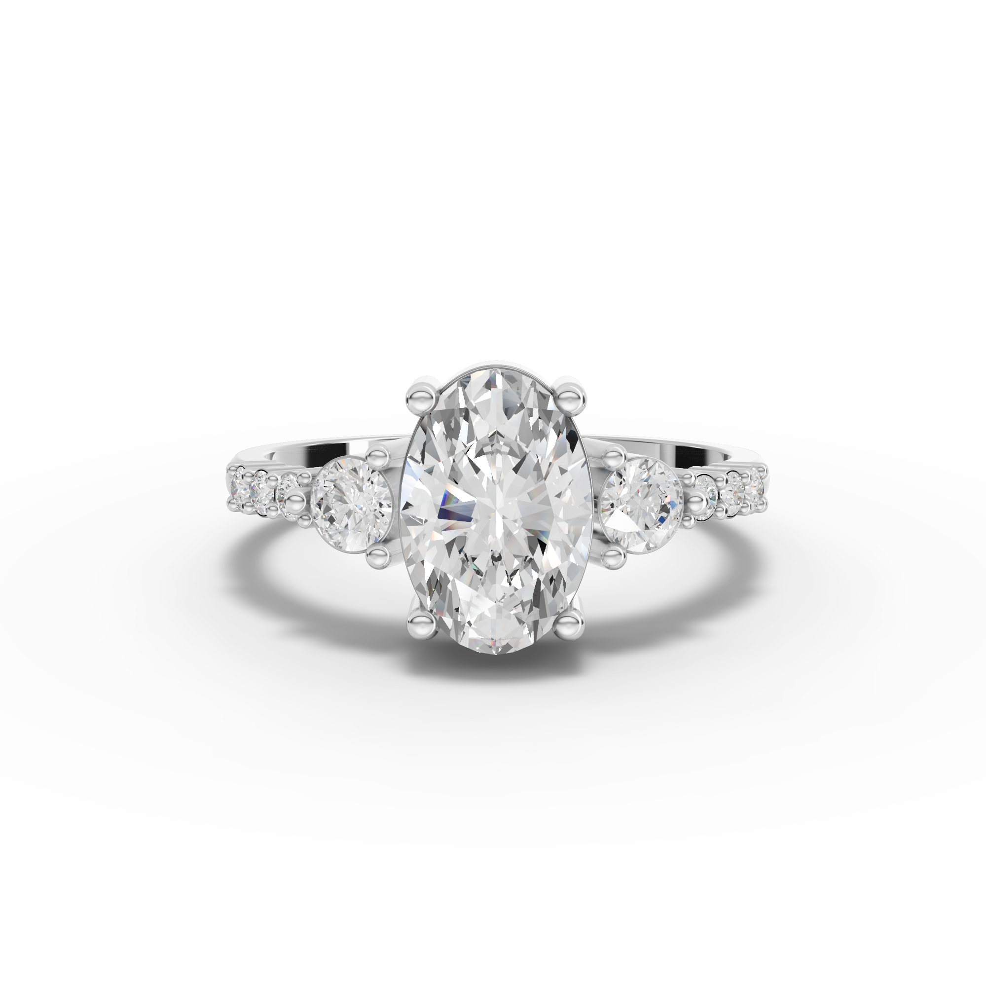Celebrate timeless elegance with this sophisticated three-stone ring featuring a stunning oval lab-grown diamond as the centerpiece, flanked by complementary stones for added brilliance. The pavé band showcases meticulously set diamonds that catch light from every angle, creating a luminous frame around the center stone. Lab-grown diamonds offer exceptional quality and clarity while providing an ethical, sustainable choice without compromising on beauty or durability. Perfect for engagements, anniversaries, or milestone moments, this ring combines classic design with modern values.