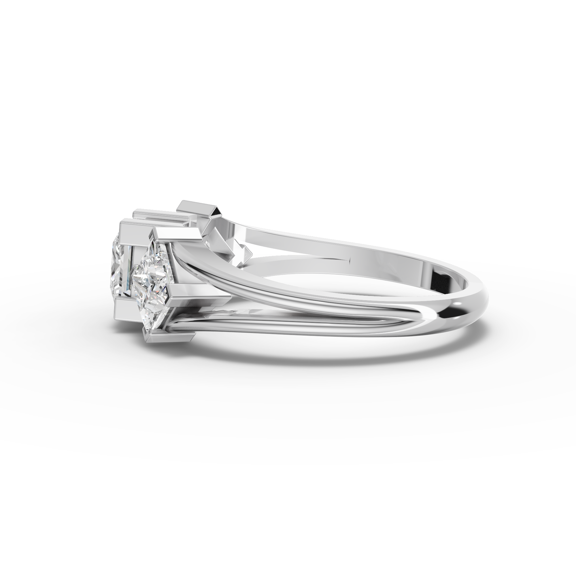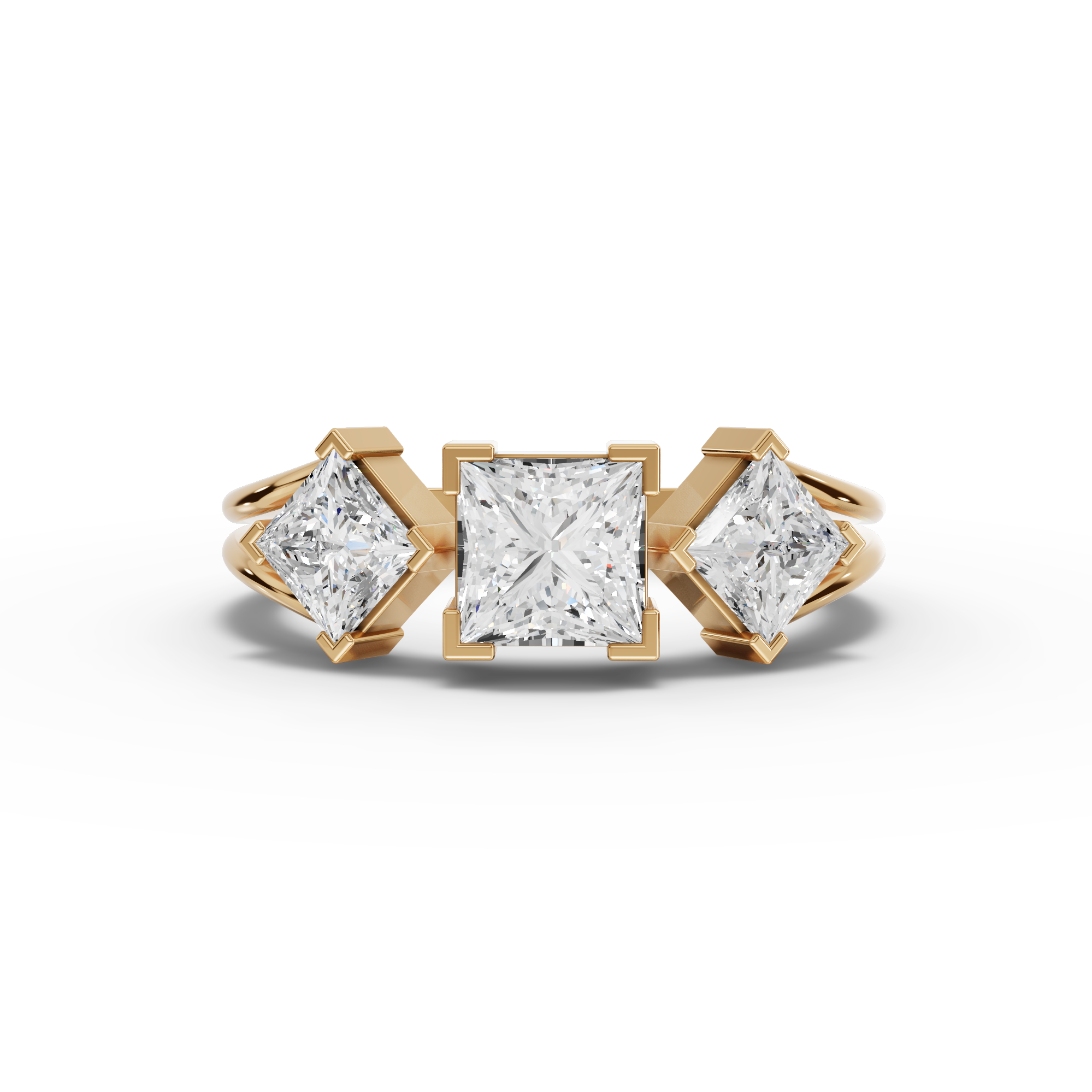 Completing the set, the three-stone ring is centered with a princess-cut lab-grown diamond of approximately 0.78 ct, flanked by two princess-cut side diamonds totaling approximately 1.20 ct, offering a balanced, architectural design with substantial presence and refined sparkle.