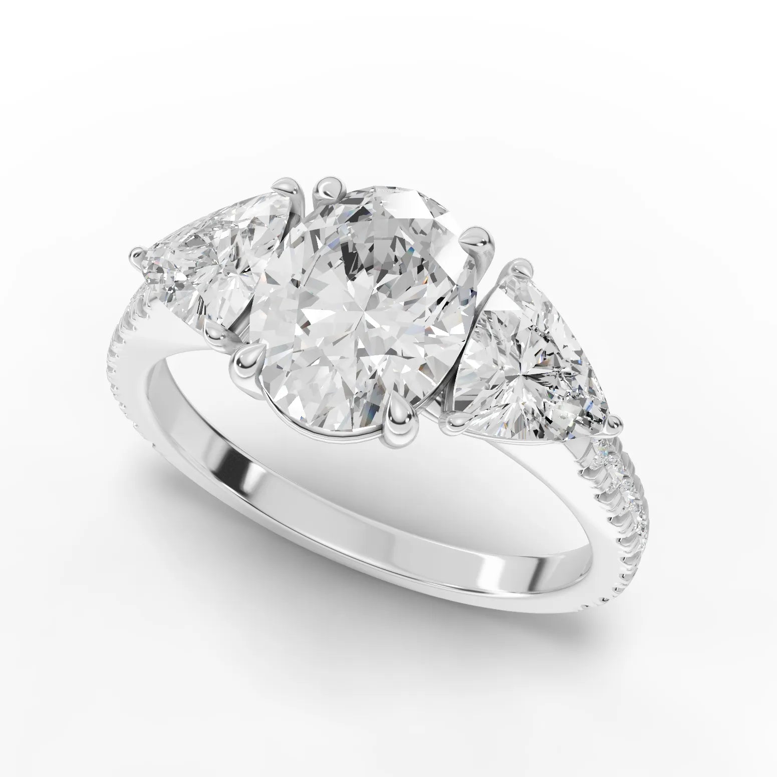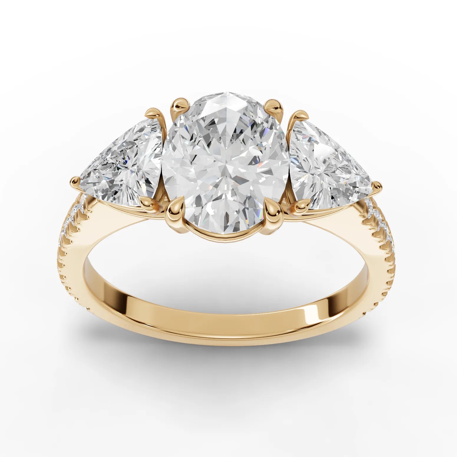 Elevate your engagement with this sophisticated three-stone oval lab diamond ring, featuring a stunning oval-cut center stone flanked by brilliant trillion-cut accents. Crafted with a warm yellow gold finish, this design combines timeless elegance with contemporary flair. Lab diamonds offer exceptional quality and brilliance while providing an ethical, sustainable alternative to mined stones. The balanced proportions of the oval and trillion cuts create a harmonious, eye-catching silhouette that captures light beautifully from every angle. Perfect for those seeking luxury, value, and conscious craftsmanship in one exquisite piece.